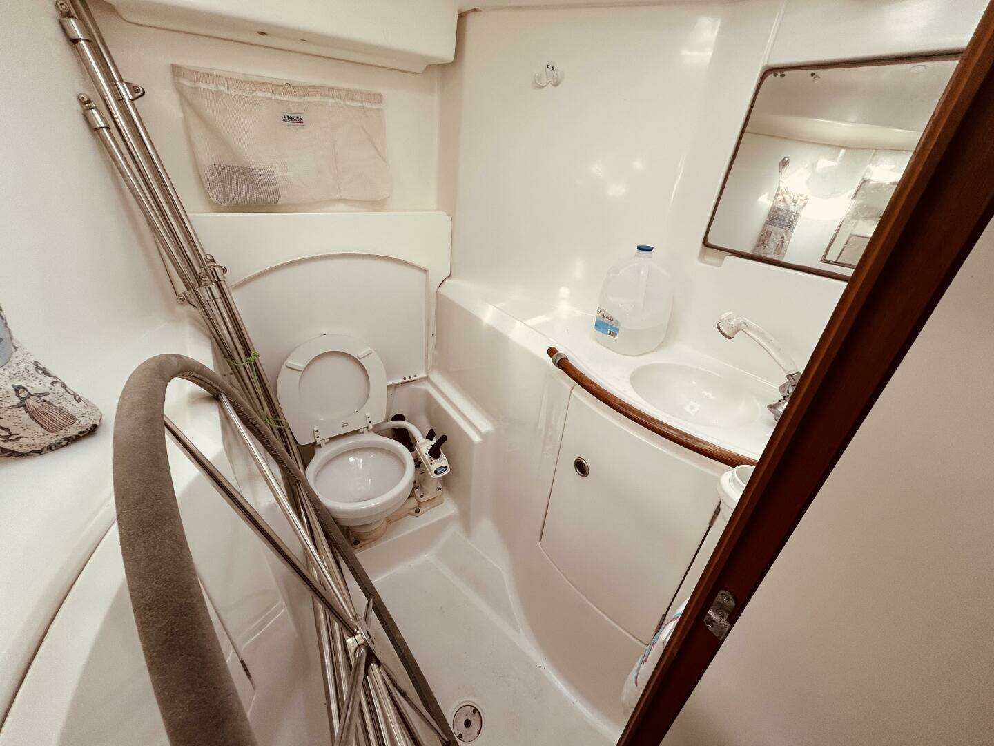 The Forward Head is in the forepeak, featuring a shower, vanity, and a Jabsco manual toilet with Y-valves to pump overboard or to a holding tank with a deck pumpout.