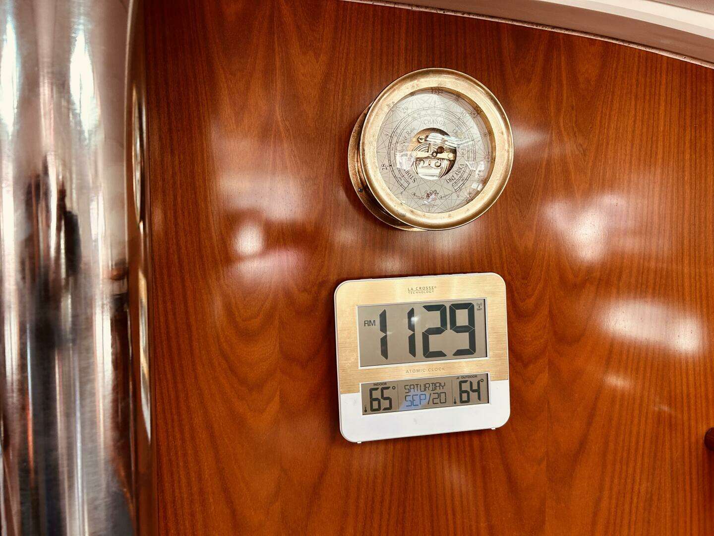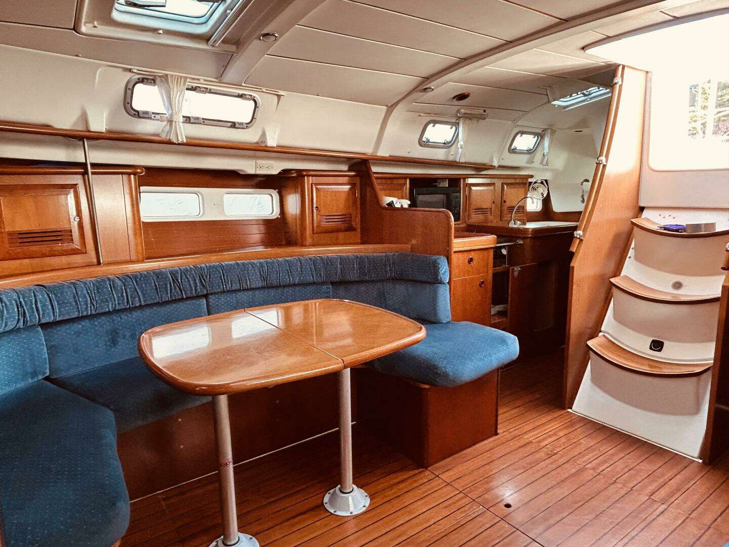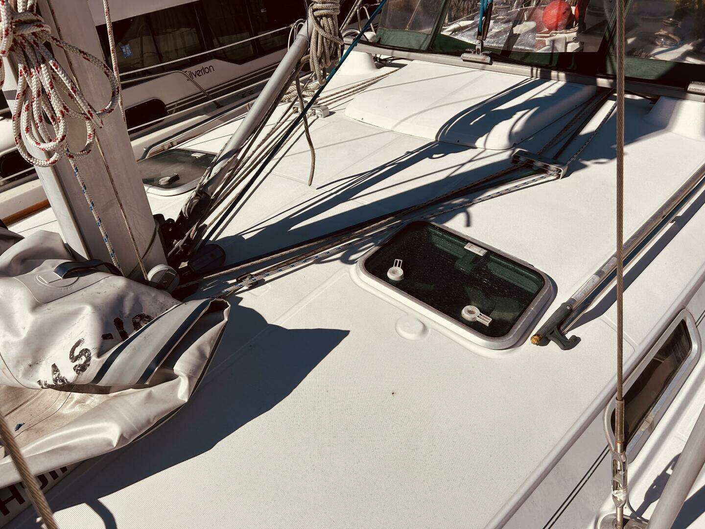 Interior accommodations feature a varnished cherry interior that is bright and clean with no evidence of hard use. Seven opening hatches and eight opening ports let in plenty of light and air. Entertainment is provided by a LG flat screen TV in the saloon and a Sony stereo system.