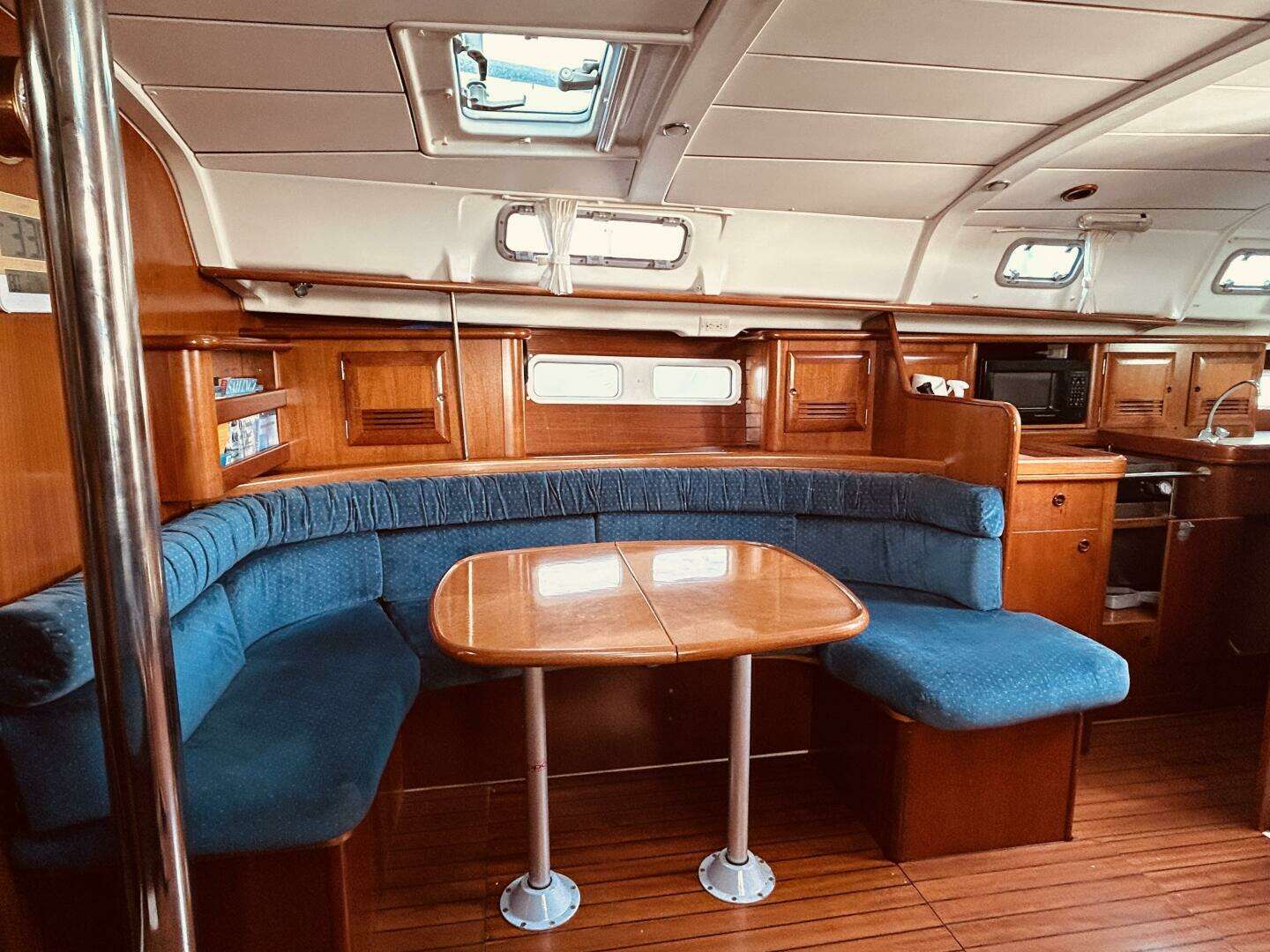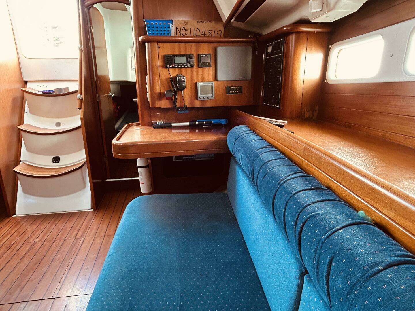Continuing aft, the Main Cabin has a C-shaped dinette to starboard that can sit six comfortably. Across to port is a settee with storage lockers and shelving outboard. The aft end of the settee doubles as a seat for the Nav Station.