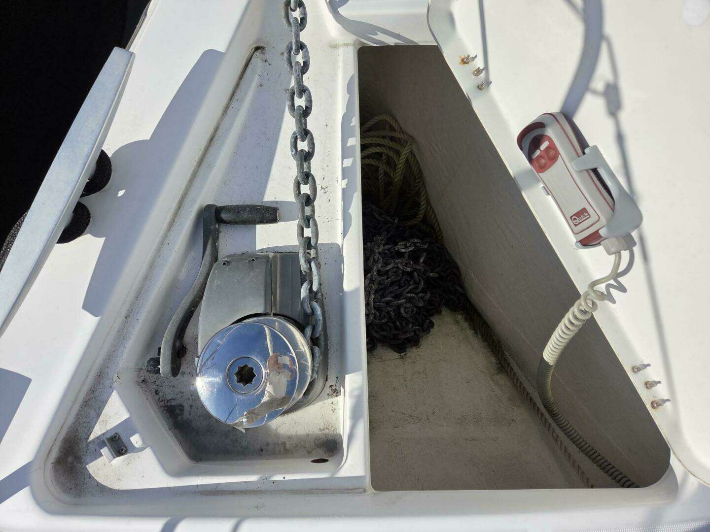 The entire cockpit is covered by a black with grey trim Iverson dodger and bimini with a connector panel which can be easily removed in good weather. At the bow is a spacious anchor locker with an electric windlass with wired remote.