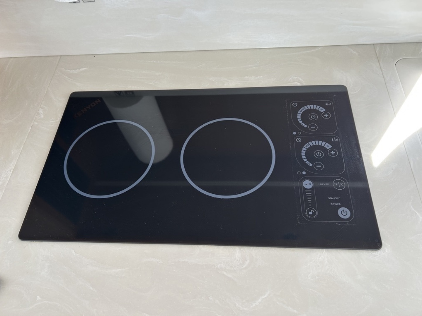 Enter the saloon/galley area through glass doors from aft deck. U shaped galley port with two burner Kenyon stove and Miele microwave oven, double stainless sinks, drop in storage, stowed toaster oven and coffee maker, Corian Nimbus Prima countertops, drawers and lockers. Opposite, starboard, is built in separate freezer and refrigerator with storage above, and Isotherm ice maker. Forward is built in countertop with access to air conditioner below and large picture window above.