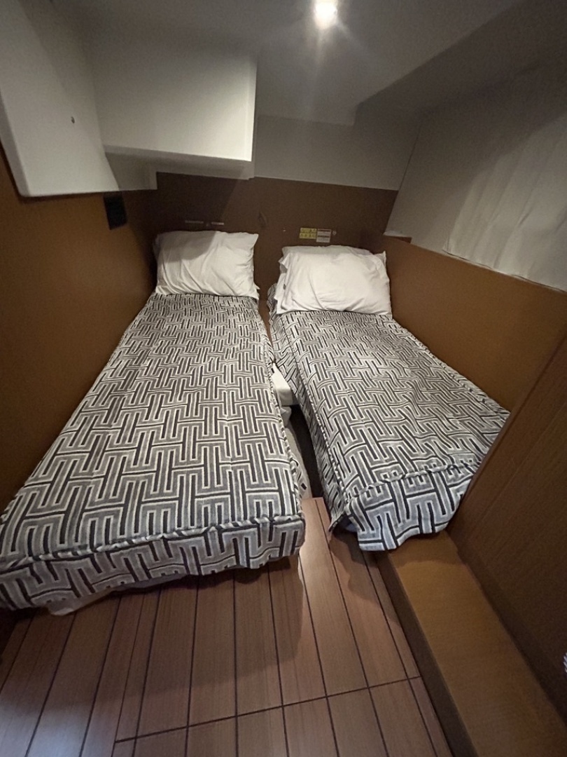 Overture offers a master stateroom forward V-Berth with an island queen size and an split ensuite head to port with an enclosed shower to starboard, and a guest stateroom to port with twin single sizes beds. To starboard the guest head and a third stateroom with single bed and washer/dryer combo.