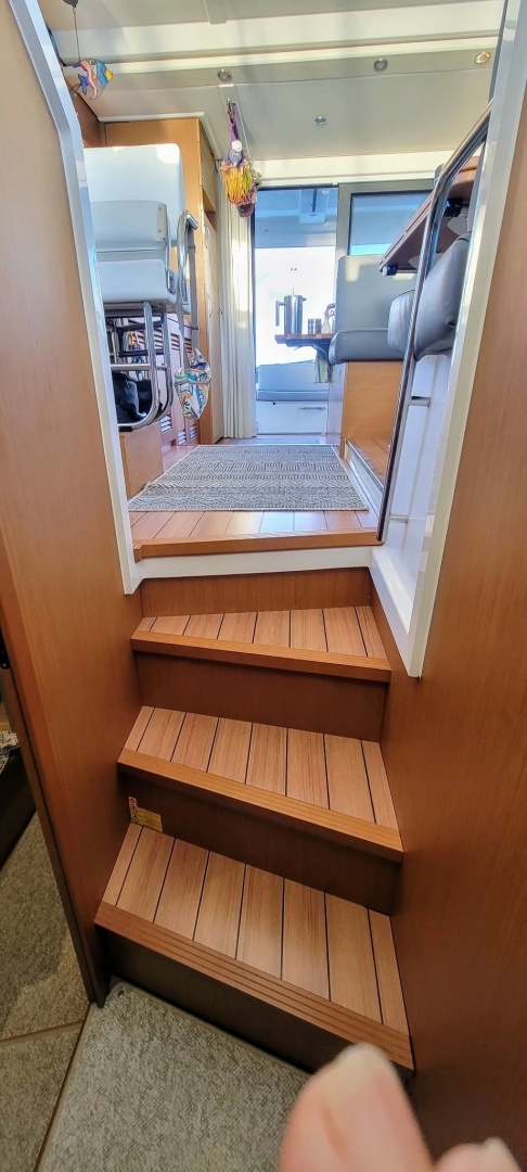- Flybridge enclosure — owner upgrade converting the flybridge into a weather-protected all-season lounge and helm