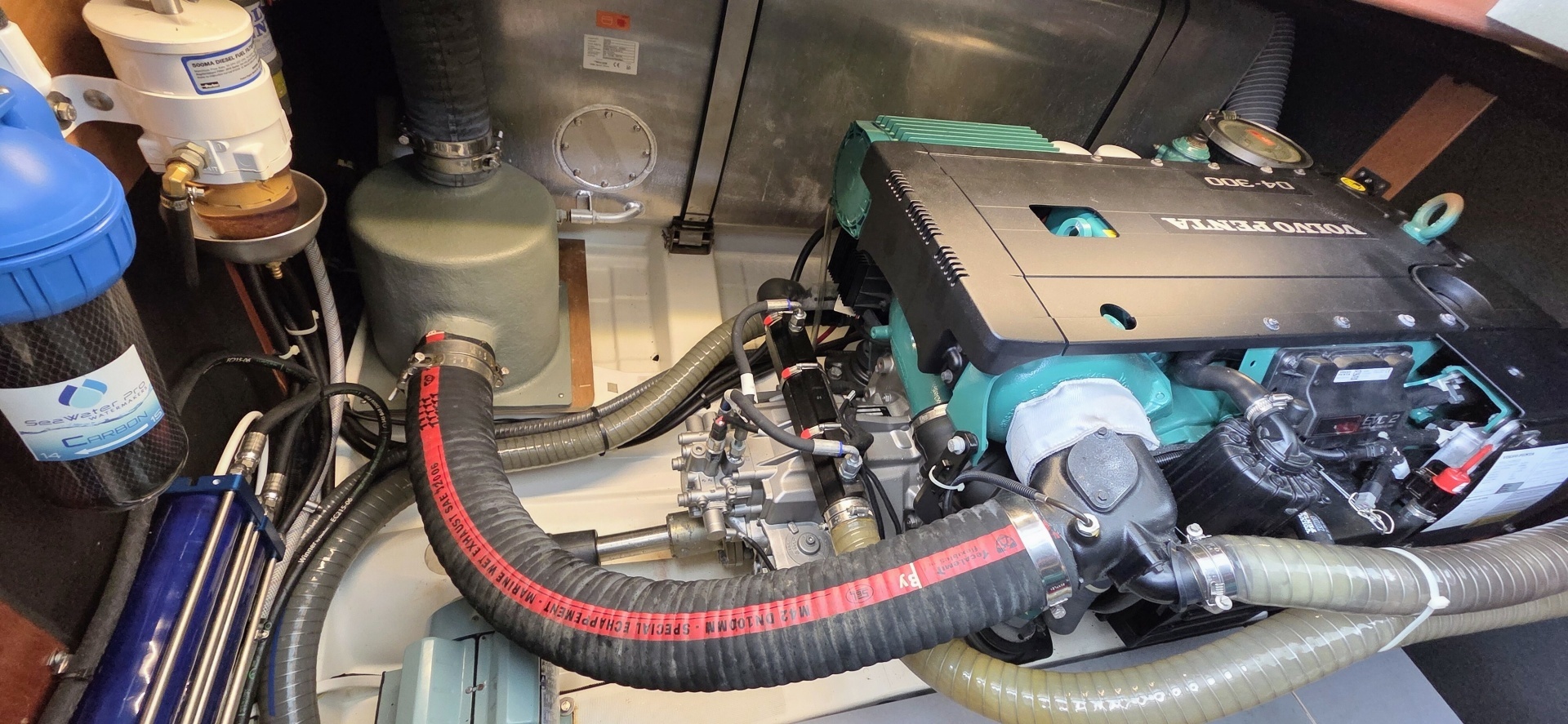 Power comes from twin Volvo Penta D4-300 diesel engines and direct drive shaft deliver confident cruising speeds and ample reserve for adverse conditions. The port engine shows 517 hours and the starboard 513 hours (at the time of listing), reflecting a very young, well-matched drivetrain. Two Racor engine water separator filters are fitted, providing an important layer of fuel protection for offshore passages.