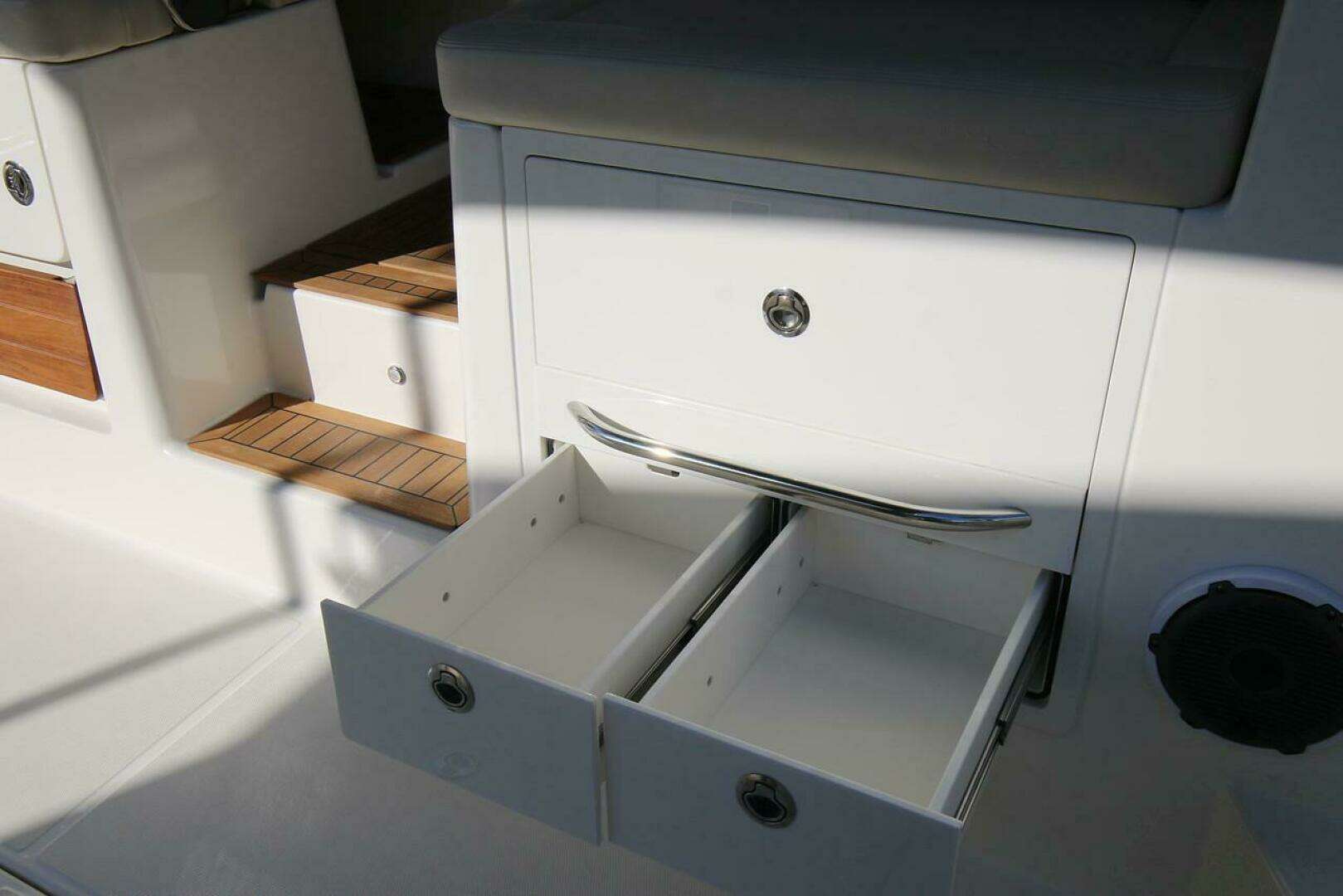 - Helm deck – starboard helm storage drawers and forward storage tray