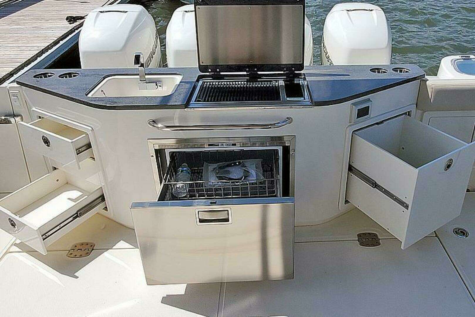 - Helm deck – starboard wet bar storage drawers and storage compartment