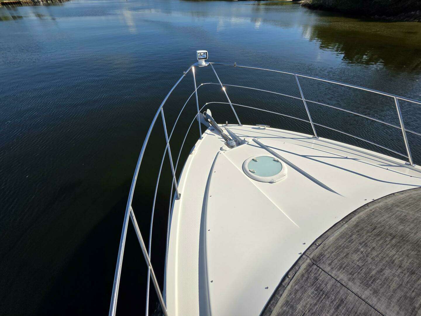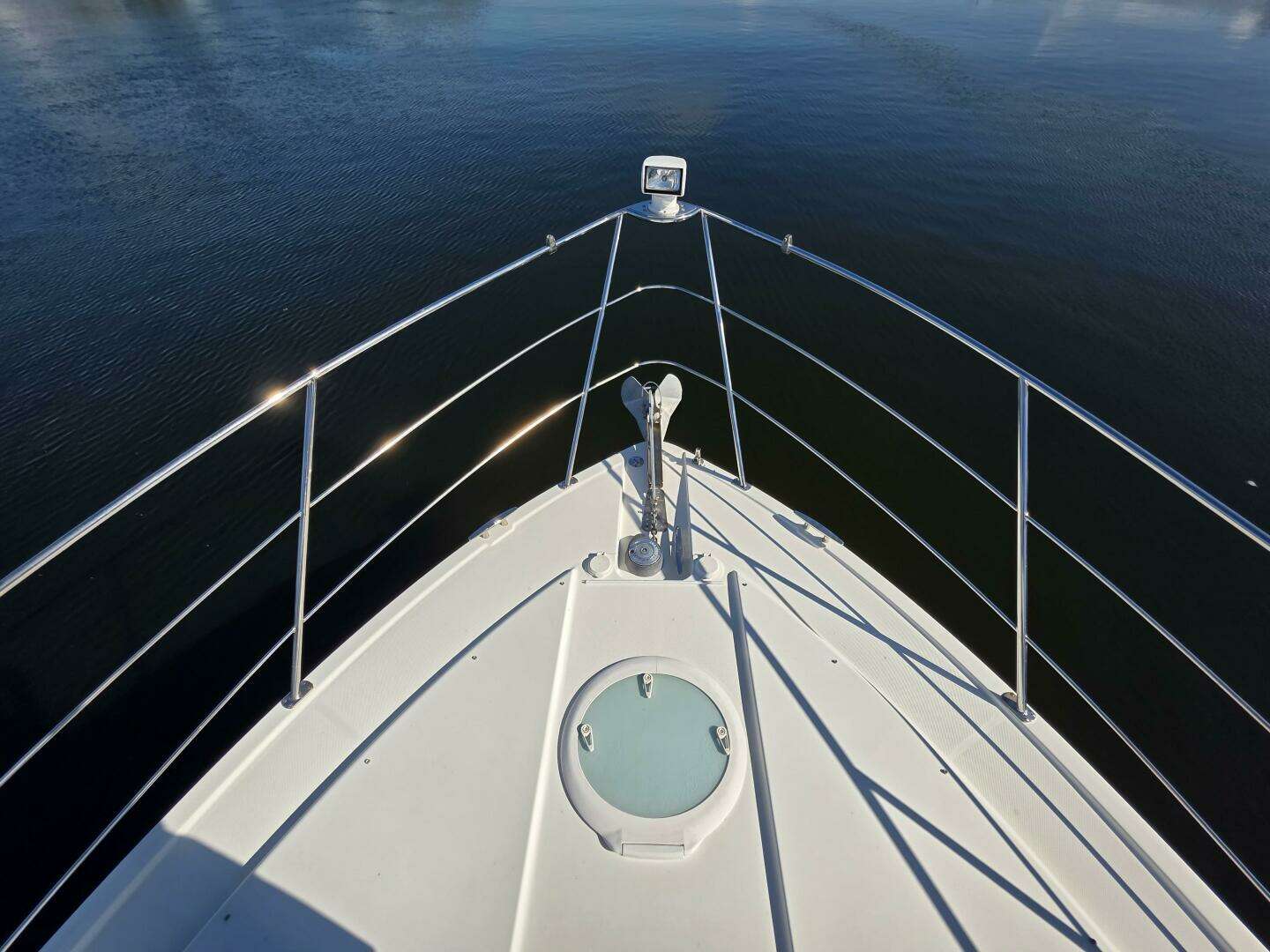 Deck hardware tends to be comprehensive: windlass with anchor, under-seat/deck storage, often canvas enclosures or Isinglass, plus custom upholstery, flooring upgrades, and bow thruster.