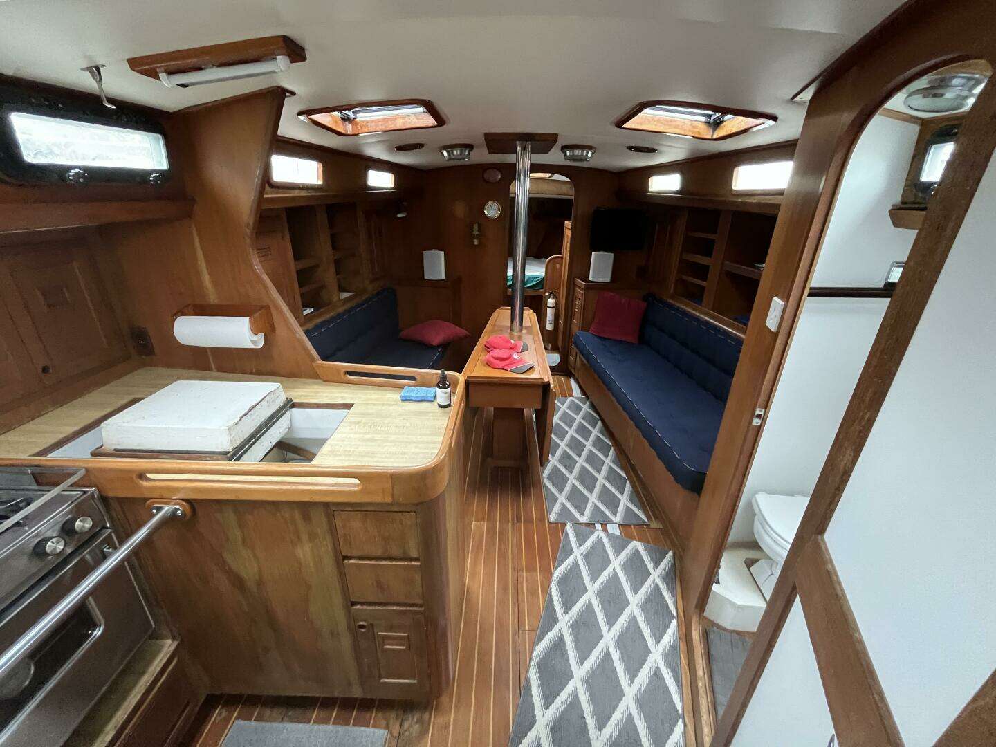 The boat's layout features a spacious main saloon with settees and a centerline table, a large V-Berth cabin forward, and a double quarter berth cabin aft. The starboard midship head includes a separate stall shower, while the U-shaped galley on the port side is suitable for preparing meals even while underway. The navigation station allows for easy communication between the navigator and helmsman.