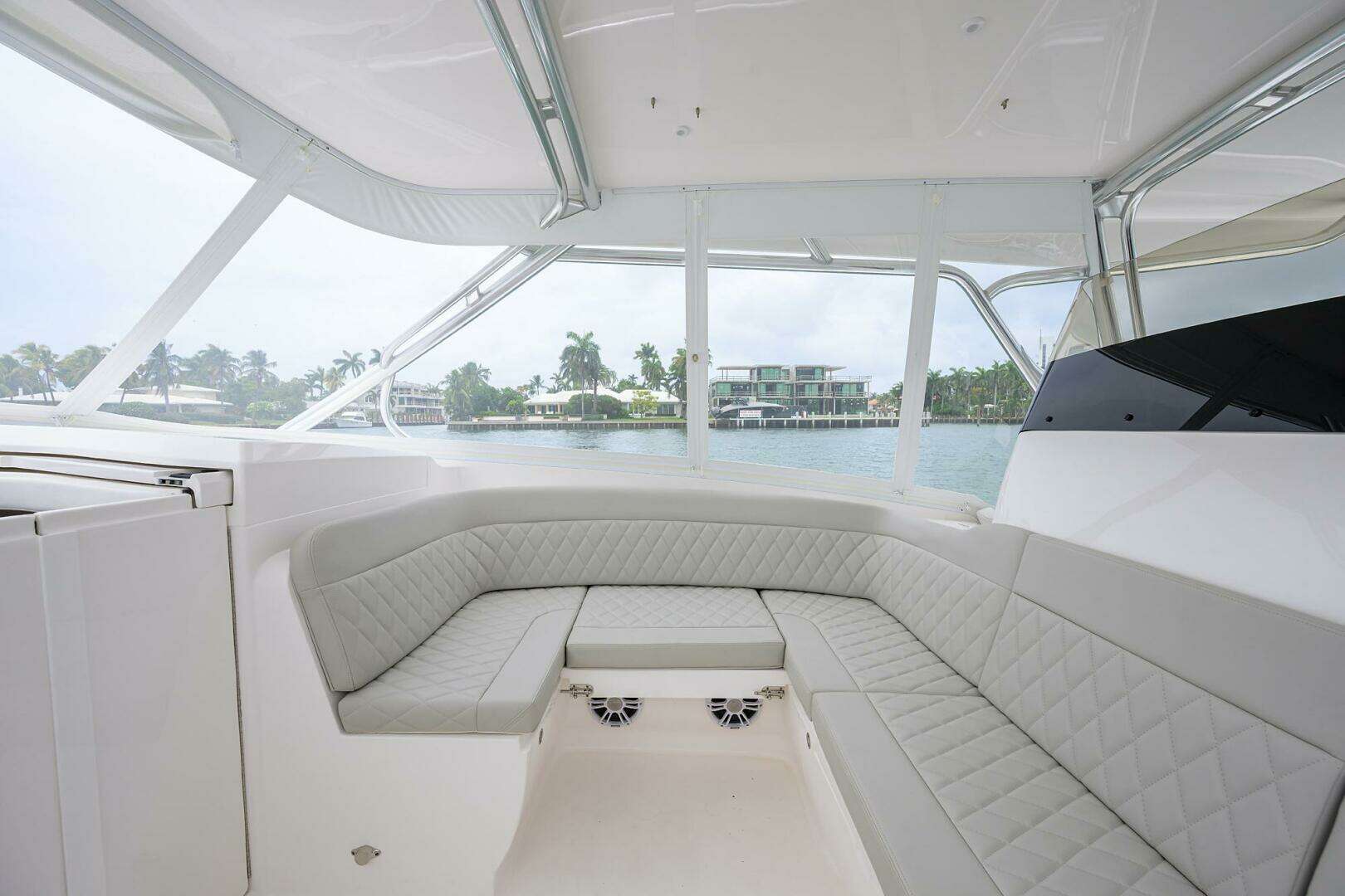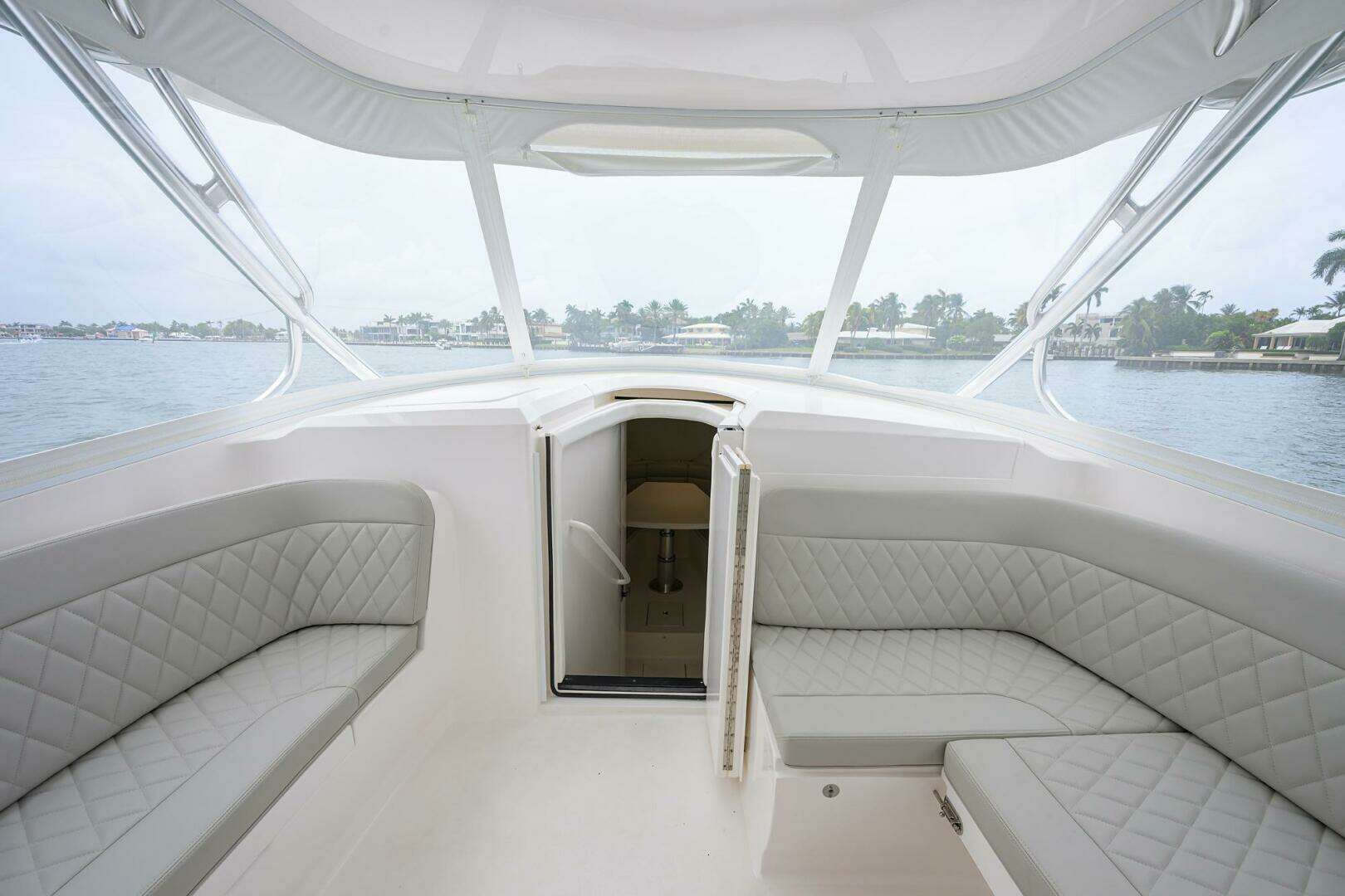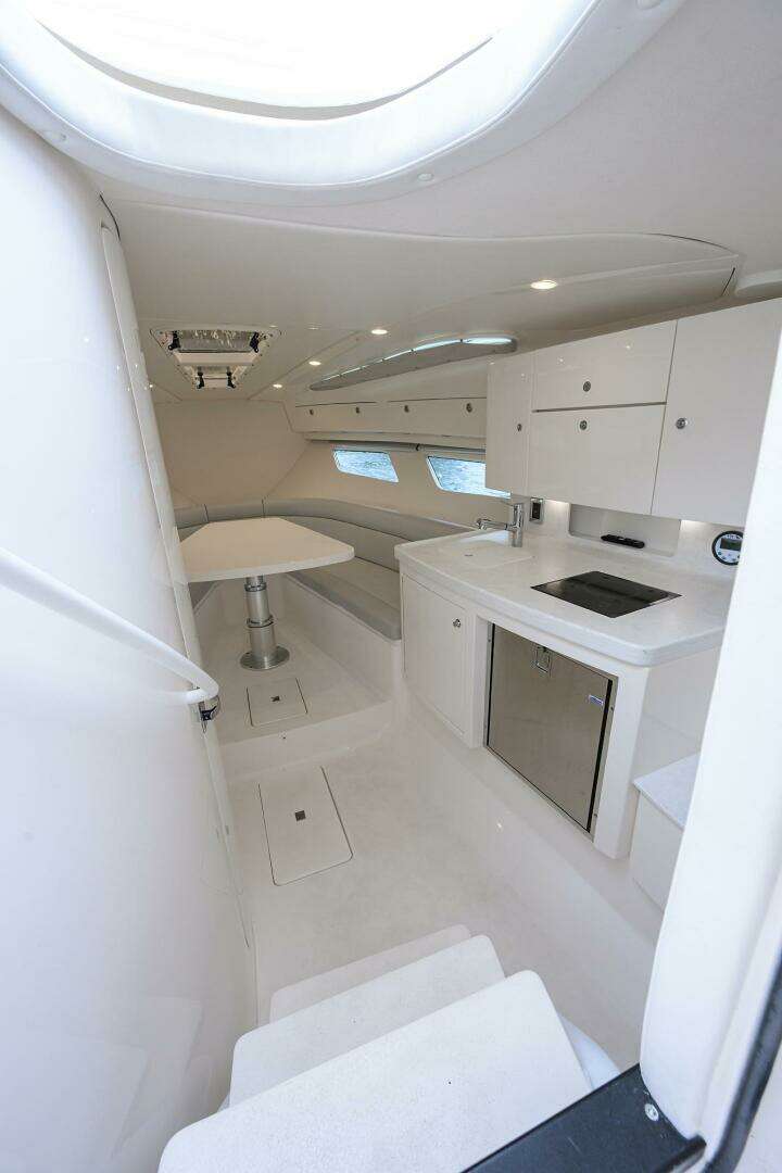 - Hi/Lo electrically actuated cabin v-berth table with filler cushion • Hull side windows with blinds creates secondqueen birth