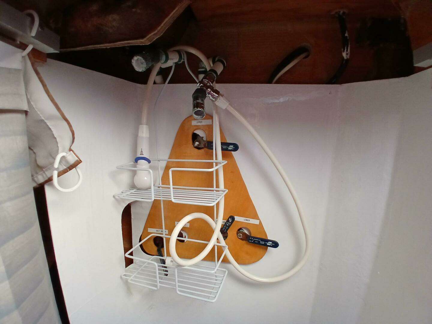 Gray water from shower basin, air conditioners and sinks in head are pumped by 1000 gpm pump to a 10 gallon grey water holding tank