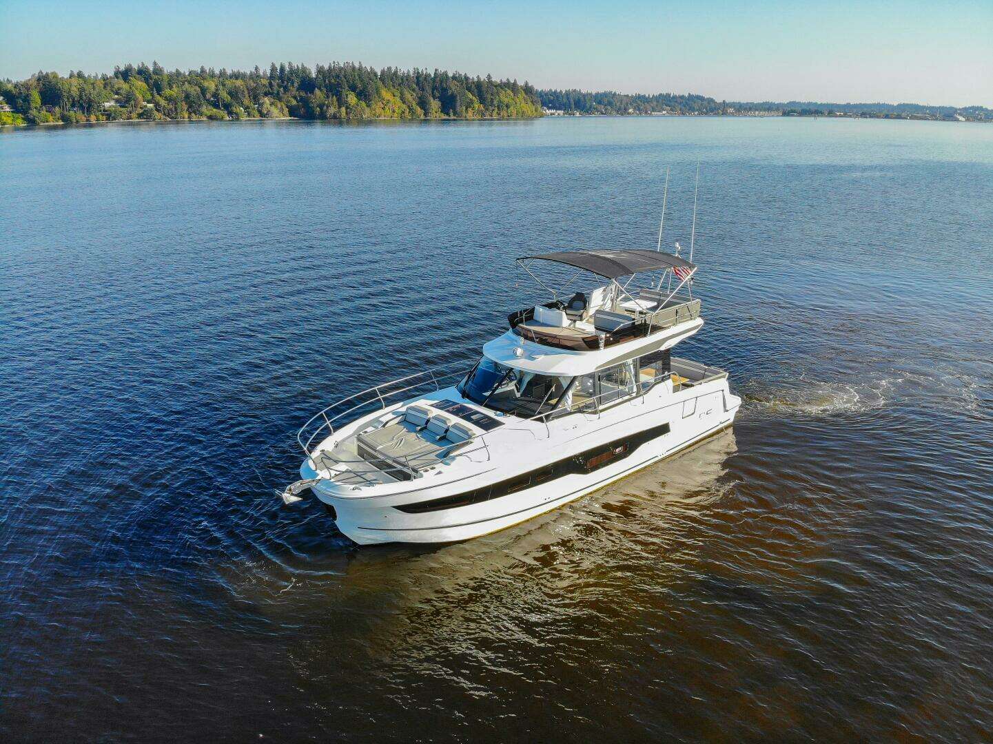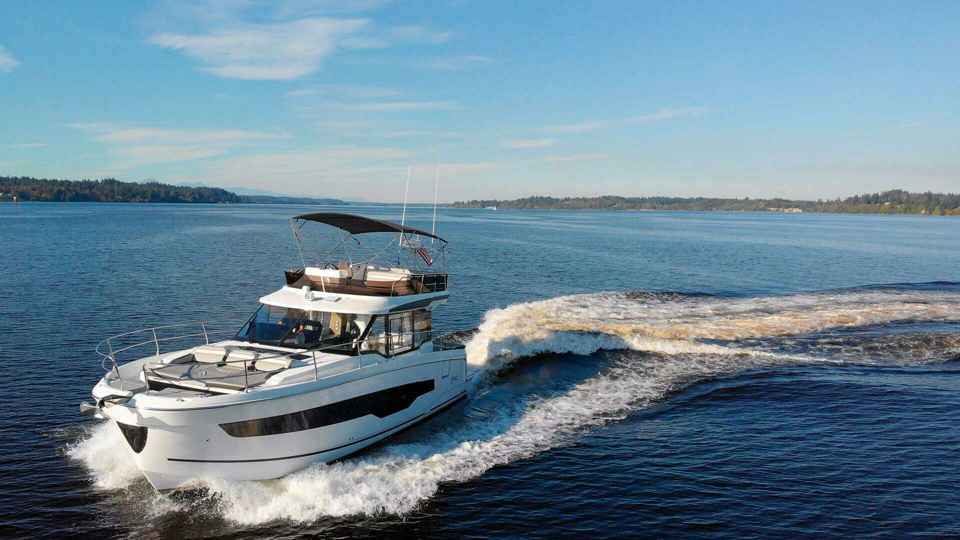 - Flybridge with bimini top, upper helm, wraparound seating, and sun-pad