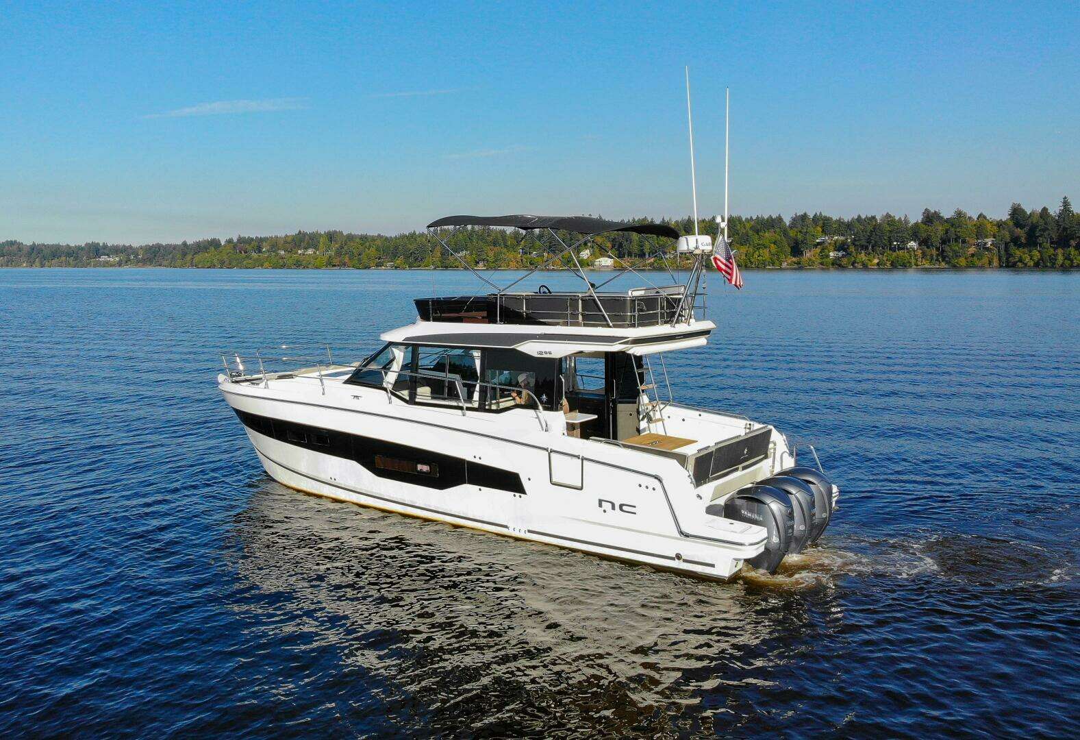 2024 Jeanneau NC 1295 Samadhi offers a 3-cabin, 2-head layout with full-beam master, open-concept salon, aft galley, and spacious flybridge. Triple Yamaha 300s, joystick docking, and versatile outdoor spaces make her perfect for entertaining and comfortable cruising.