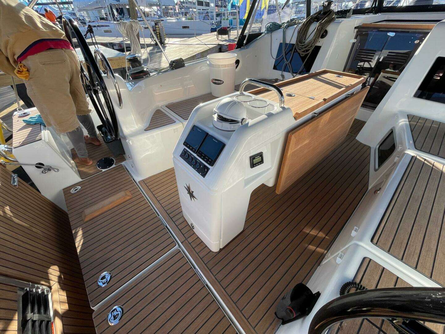 On starboard, a forward-facing nav station for two brings together all key systems in one intuitive space—complete with storage and a built-in bookshelf.