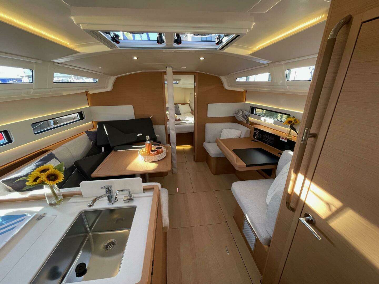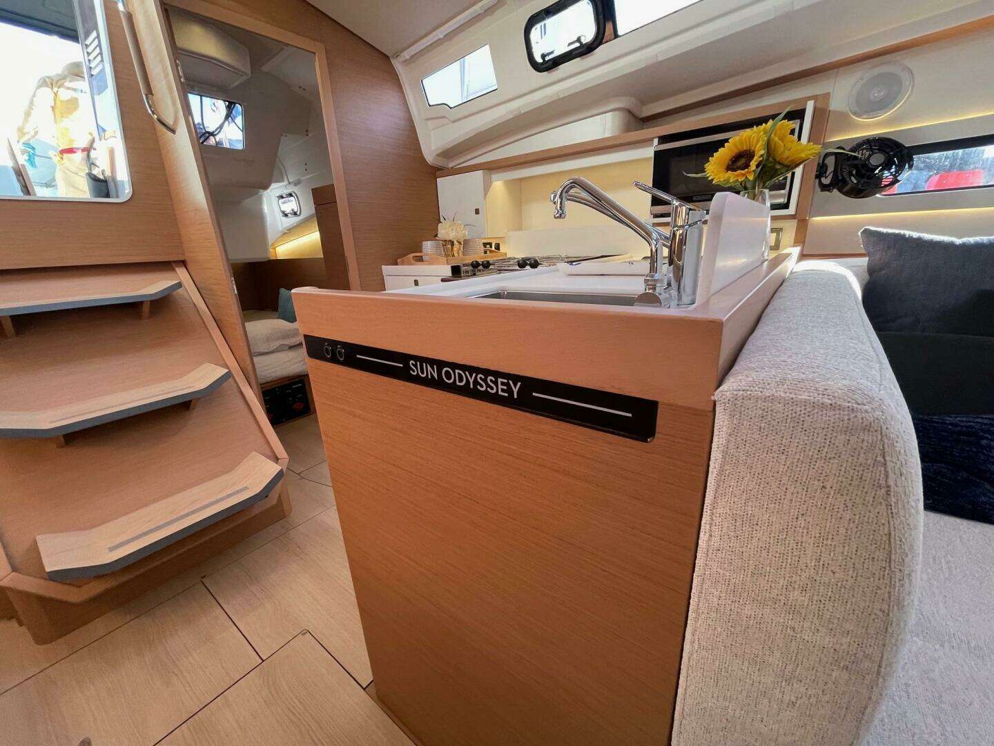 Step below on the new Sun Odyssey 415 and discover a smart, modern layout built for comfort and functionality. The redesigned L-shaped galley sits conveniently to port at the base of the companionway—perfect for easy access to the cockpit—and offers smart storage solutions throughout.