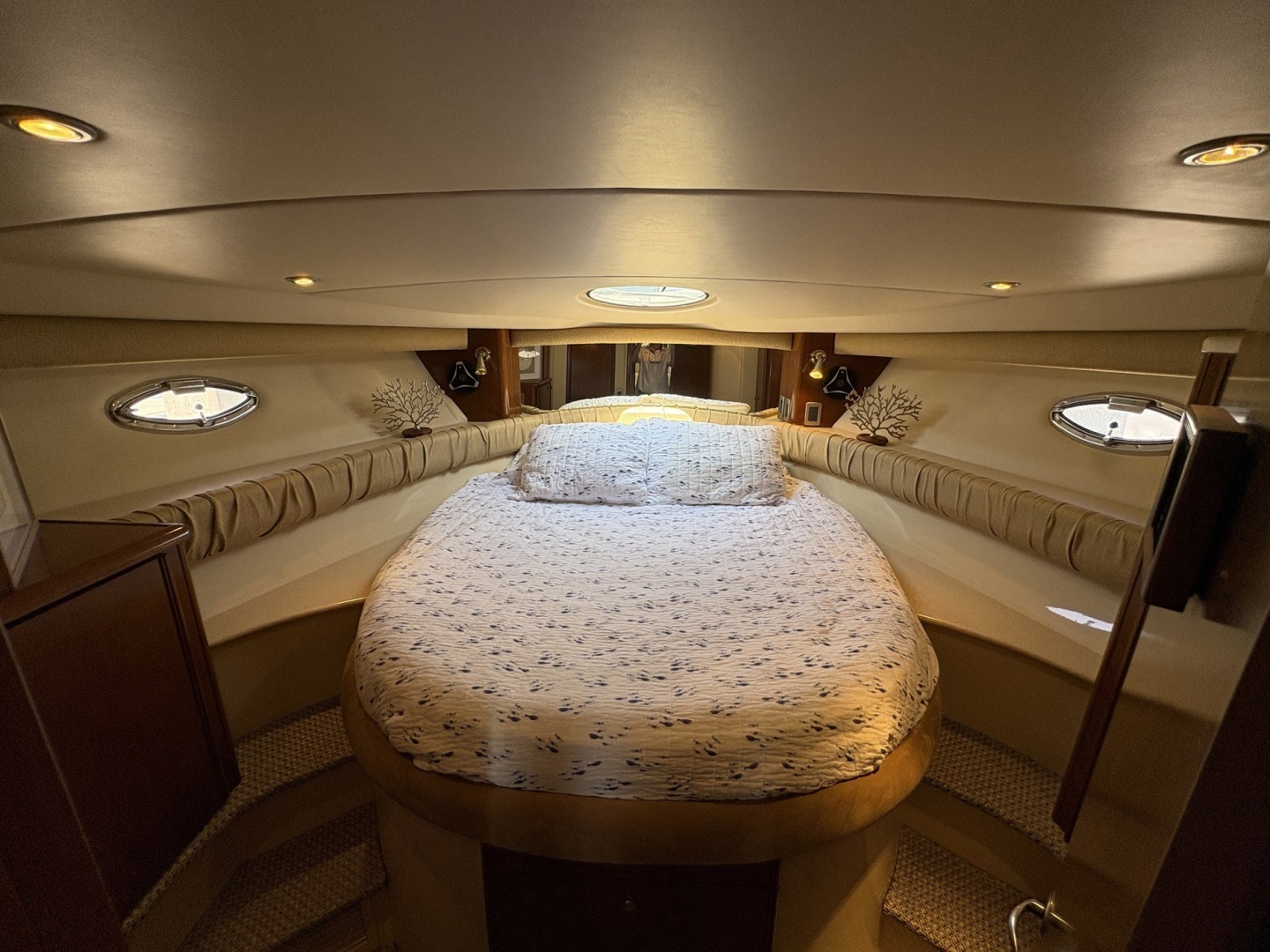 The forward master stateroom offers comfortable accommodations with a walk-around berth, generous storage, and a private en-suite head.