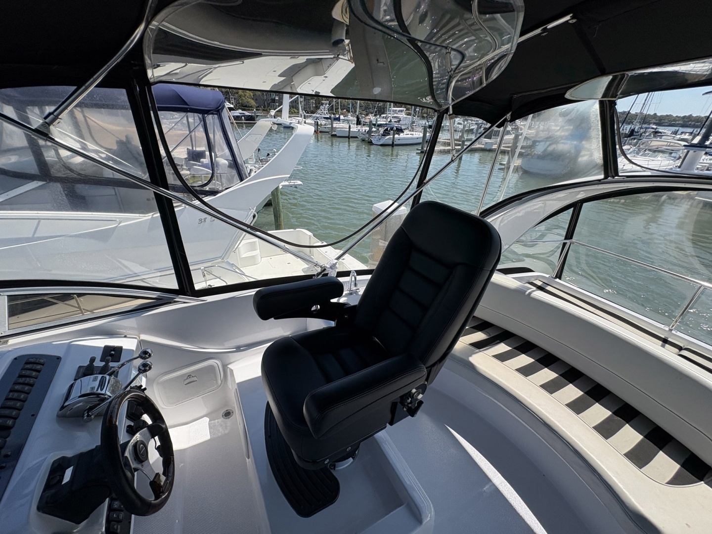 The flybridge helm station features upgraded electronics, new dash panels, and a comprehensive control layout providing excellent visibility and ease of operation.