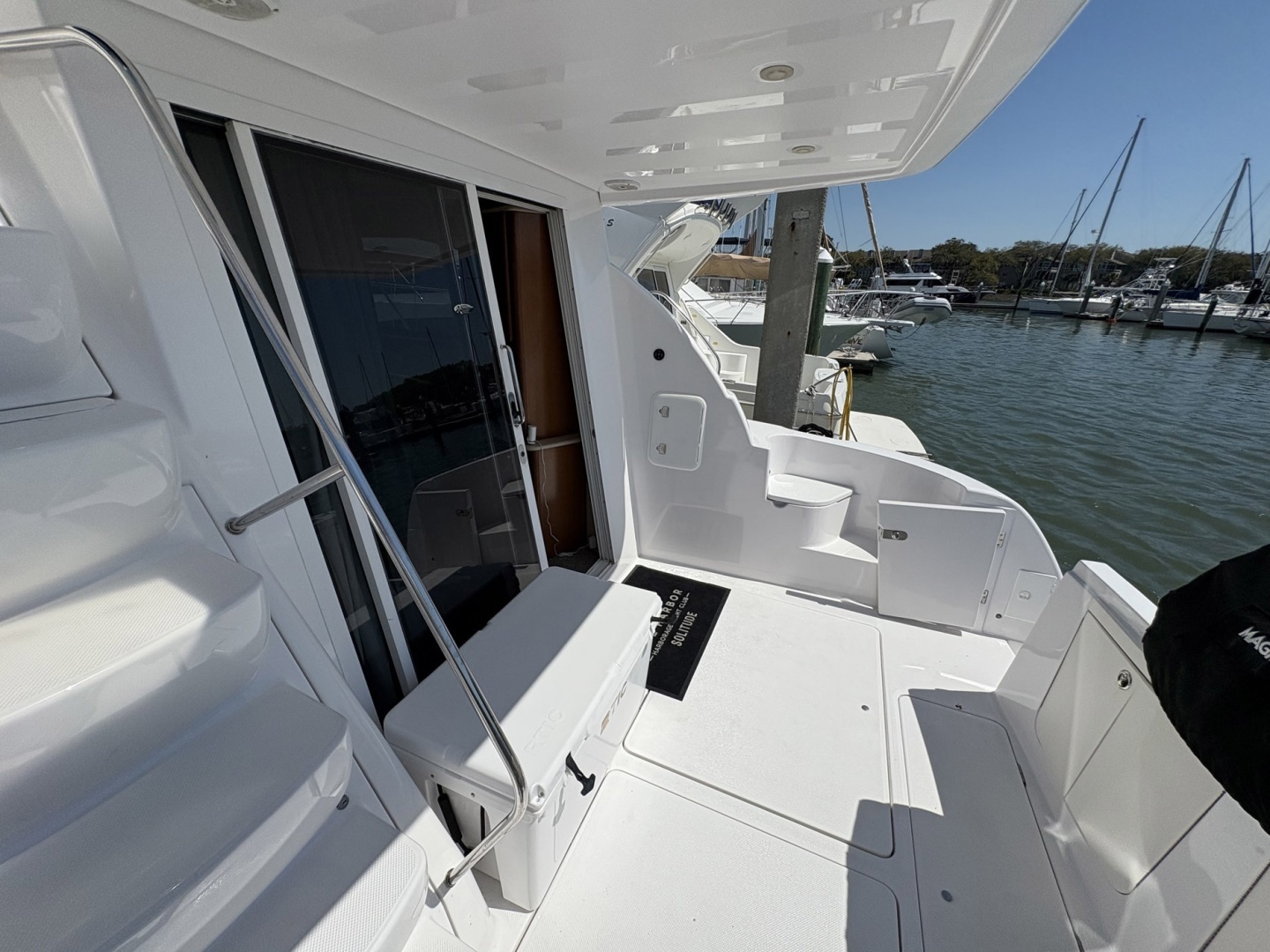 The spacious flybridge provides excellent visibility for navigation and a comfortable entertaining area for guests.