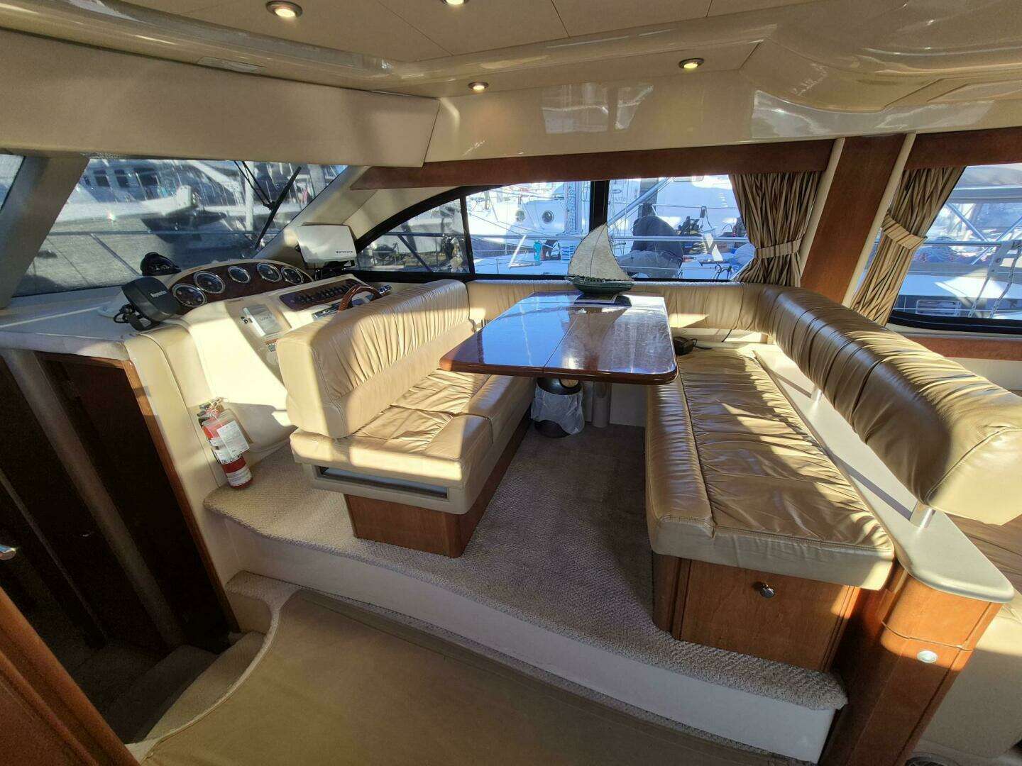 - Adjustable dinette: folding table aft of lower helm, sliding helm-seat backrest