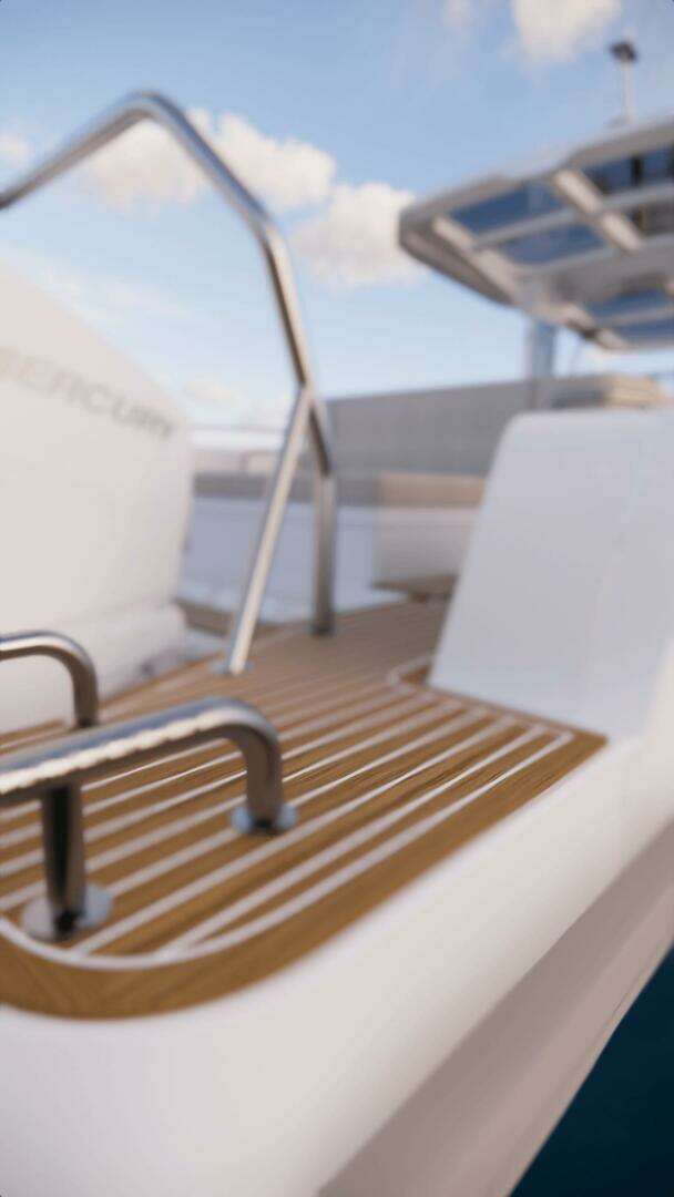 New extended swim platform with double mould for premium integration and rubrail following through on the hull