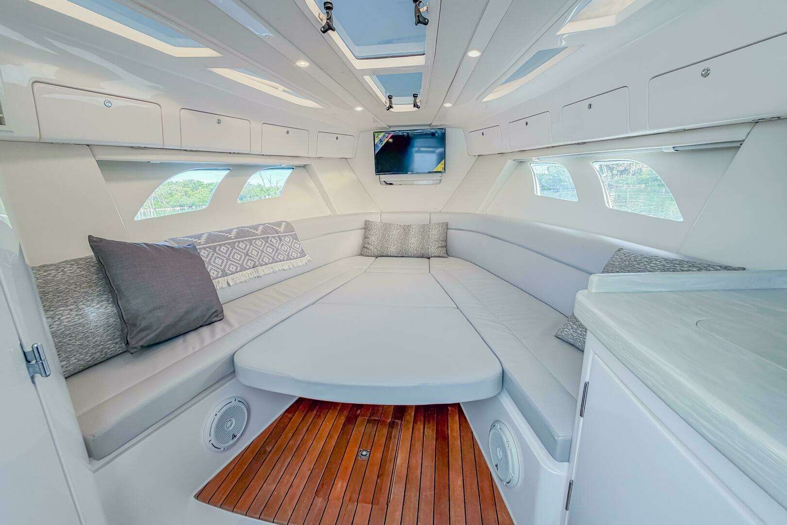 Sleek and stylish, the 407 CUDDY offers all the enhanced accommodations you would expect in a luxury performance cruiser. From a private head with shower stall and separate master berth with queen bed and hullside windows to a forward cabin section that easily converts to a large double berth. But none of it comes at the expense of the most advanced technology and fabrication techniques that deliver an incomparably smooth, dry ride with unparalleled performance. For divers and swimmers, it’s packed with thoughtful design features like a hullside dive door with step ladder and grab rails. Entertaining is elevated with cozy, custom seating and a stylish wet bar while serious sport fishermen will take note of the baitwells, rod holders, tank storage, tackle boxes and raw water washdown.