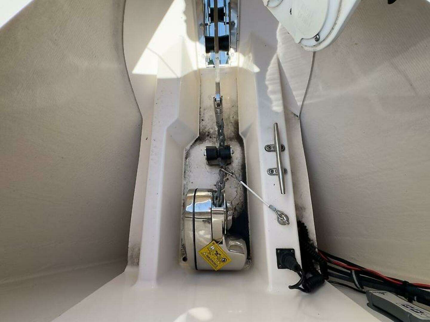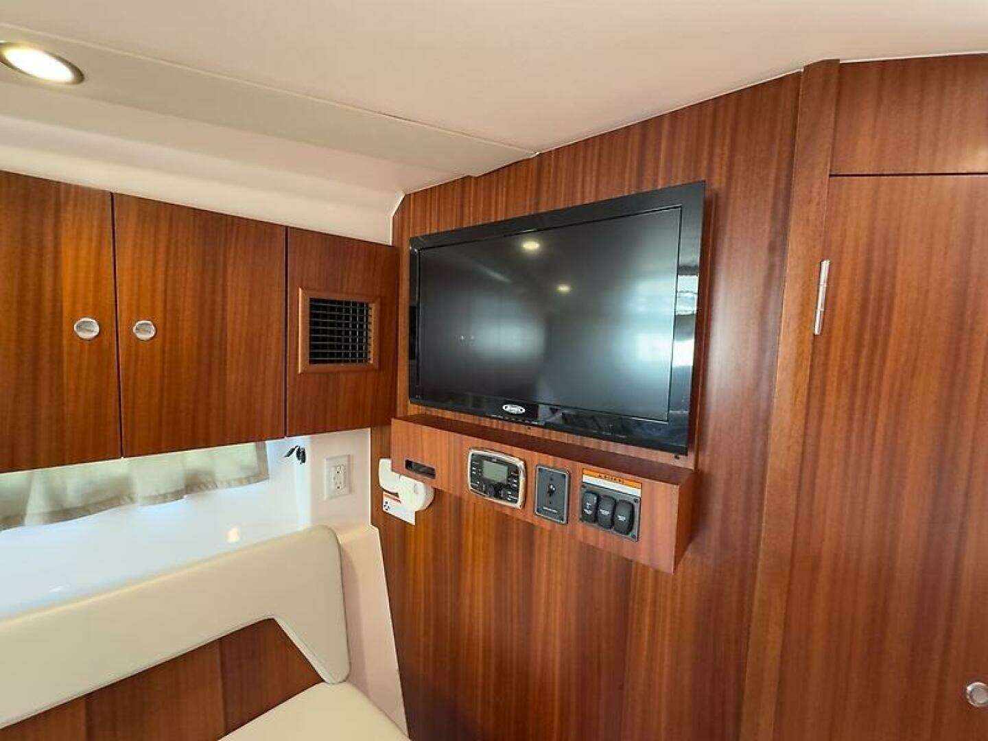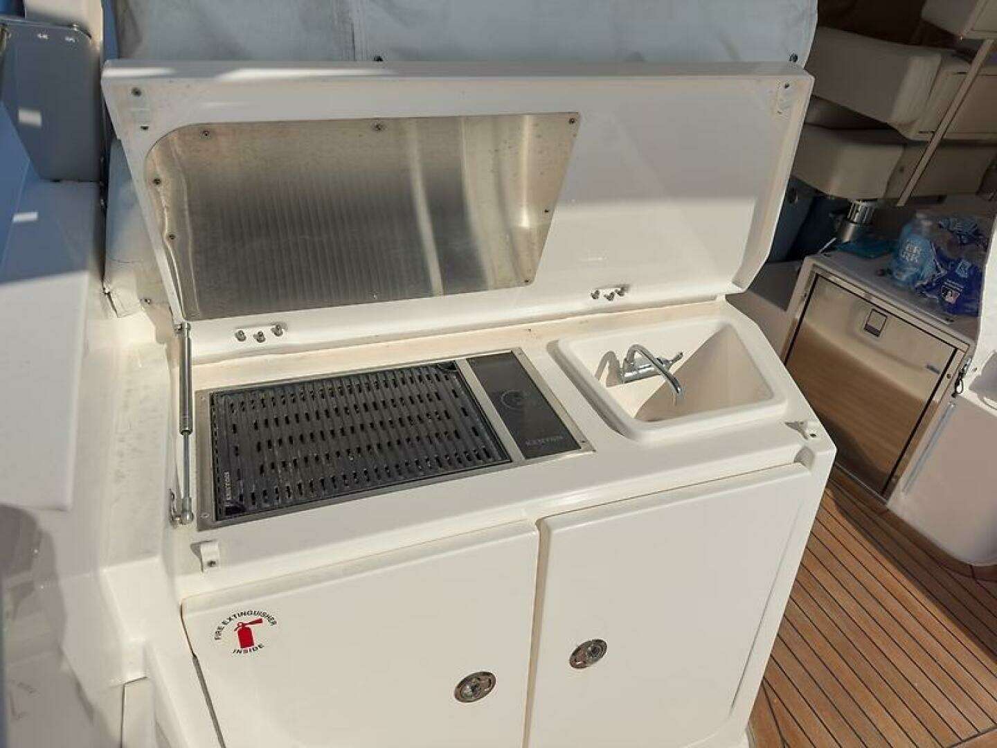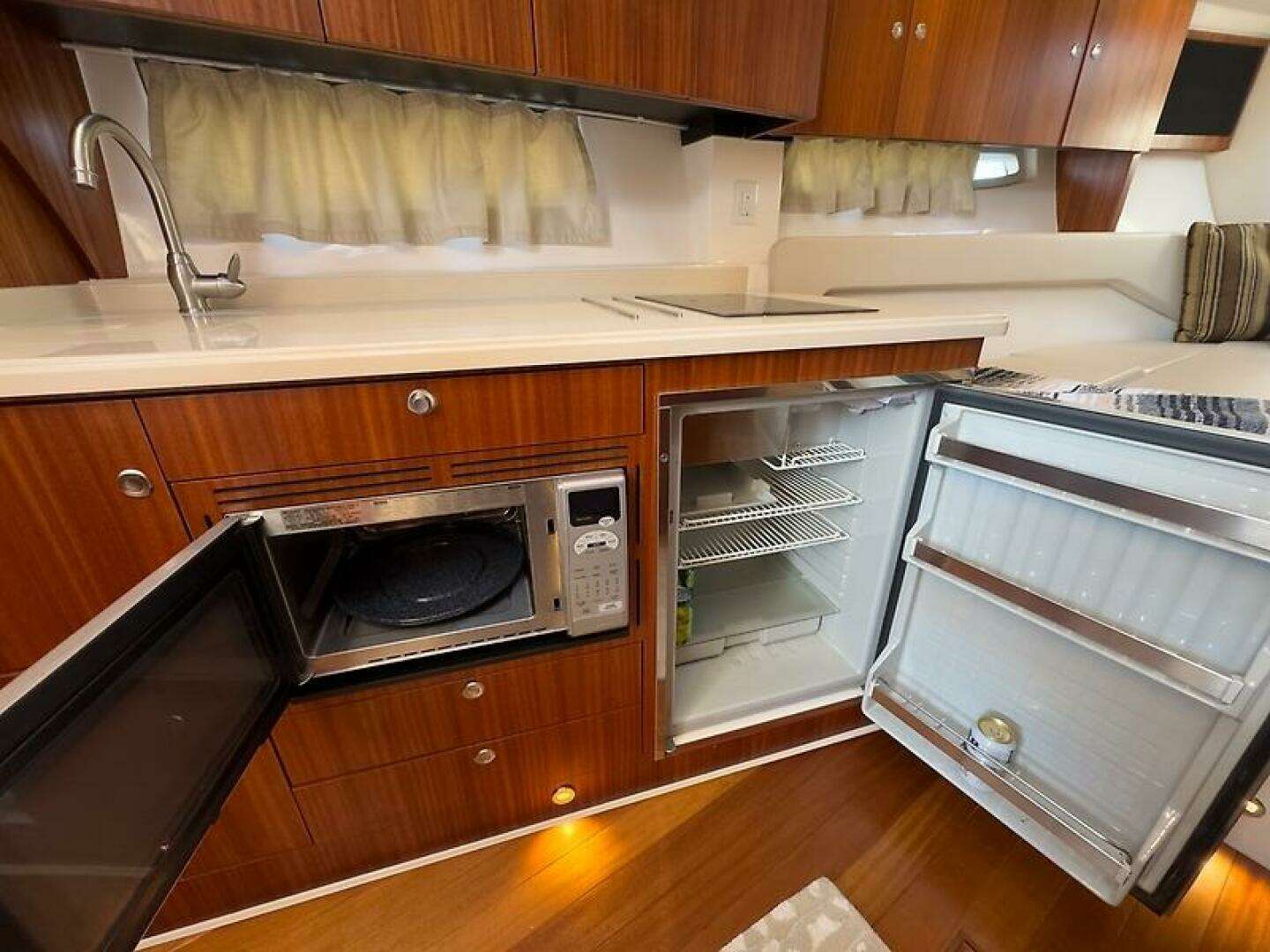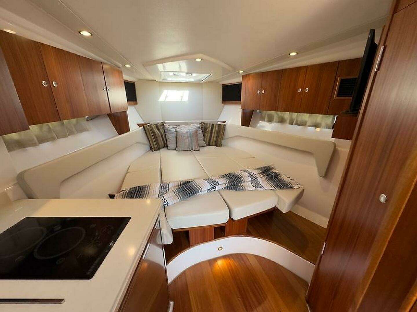 The oversized helm chair is complimented to the port side by a comfortable seating arrangement for passengers to share in the overall feel of the boat from the helm. The aft cockpit is highlighted by an extra large lounge, cushioned throughout for additional fun and entertaining. A fiberglass entertainment center conceals a sink with freshwater, electric grill and storage below. Within reach the stainless steel refrigerator keeps your refreshments cold and ready to serve.