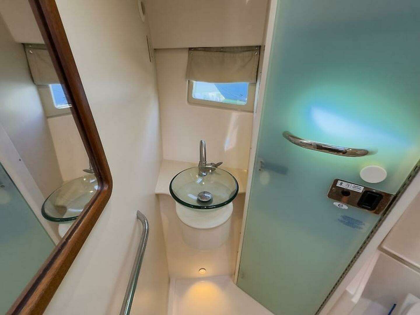 Natural light filtering through six hull side windows port and starboard and three deck windows overhead, adds to the openness of the cabin layout. A galley, head, convertible dinette and full beam midcabin are expertly engineered and appointed. The forward convertible dinette becomes an island berth when you pull each seat inboard. Add the single or twin bed arrangement in the midcabin and 4 adults can overnight in complete comfort.