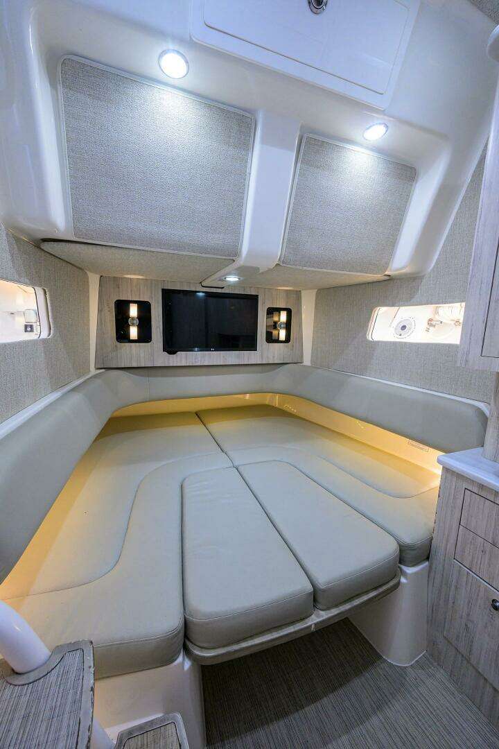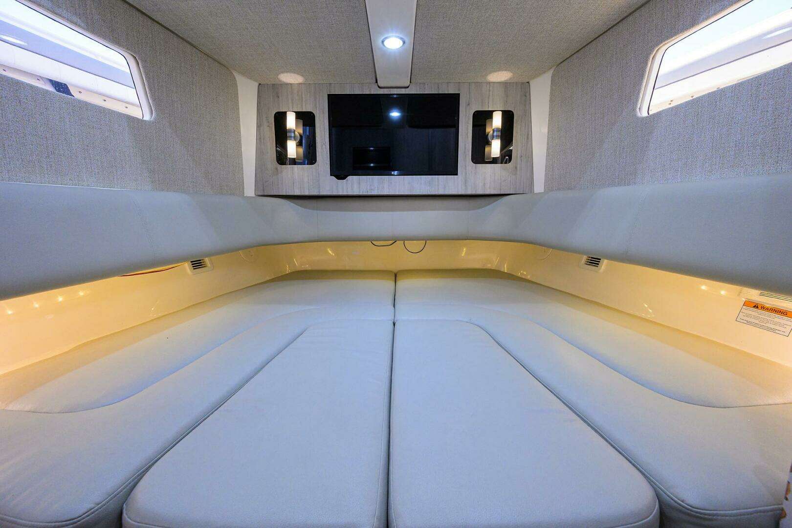 - Flat panel LG television mounted on the forward bulkhead with sconce lights on either side