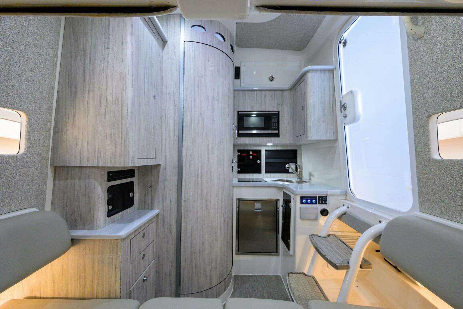 - Retractable summer kitchen to include Kenyon electric grill, freshwater sink, Corian countertops, cutting board and two cupholders.