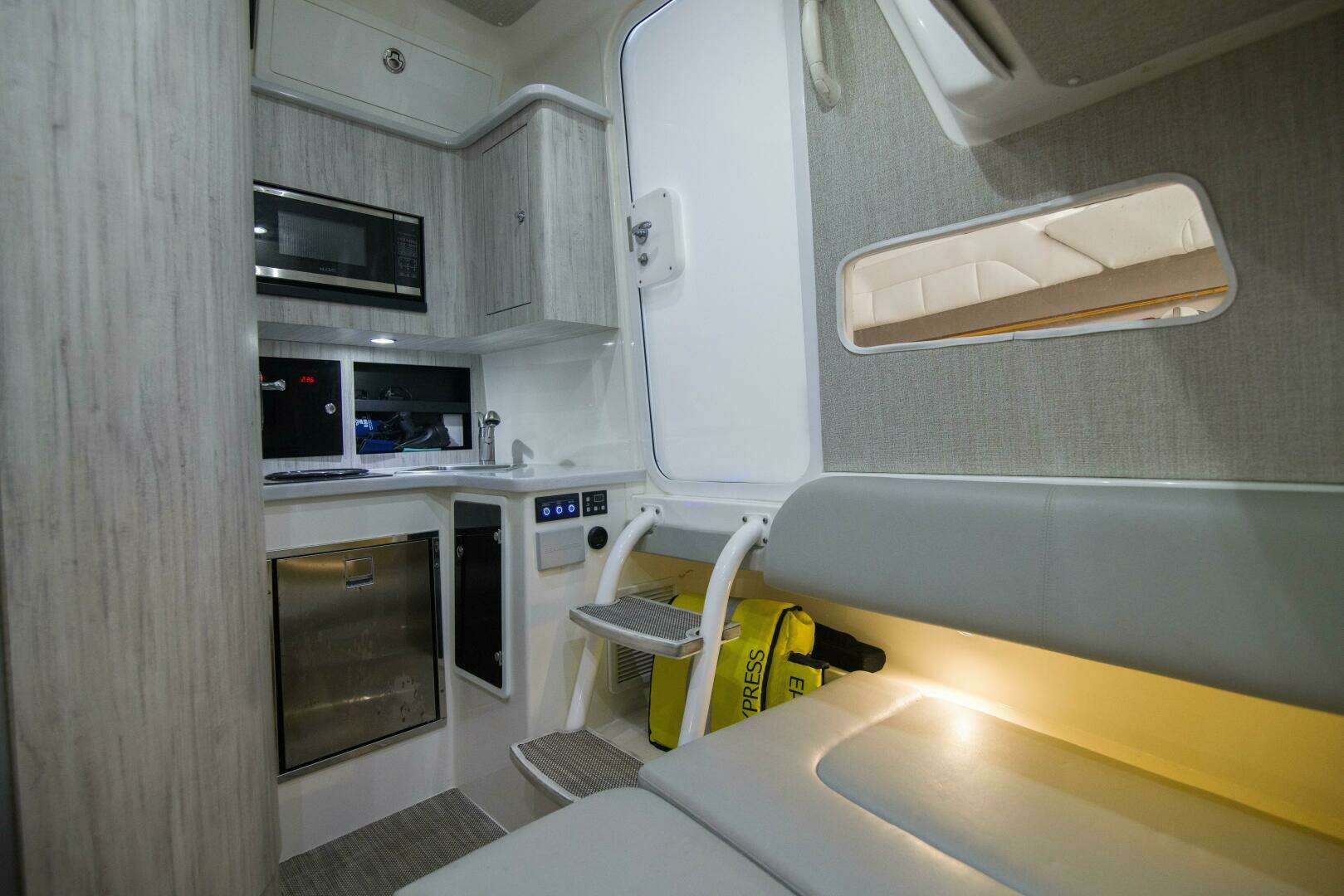 - Galley with refrigerator, microwave, sink, Kenyon single burner cooktop, and cabinet storage