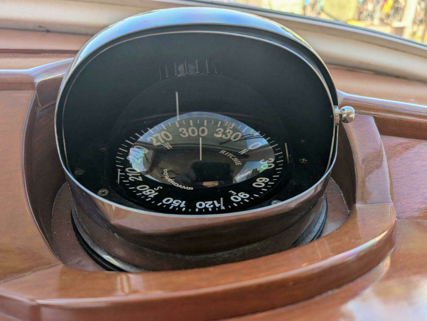 The wonderful cast stainless steel stem head alone is enough to make some people swoon. That shiny crown tops a gracefully curved stem, which differs from most of the “Commuter’ yachts as they had a plumb, or nearly plumb, stem. This curved stem also complements the reverse sheer. Reverse sheer is more than a styling exercise-it increases interior volume and reduces windage topside.
