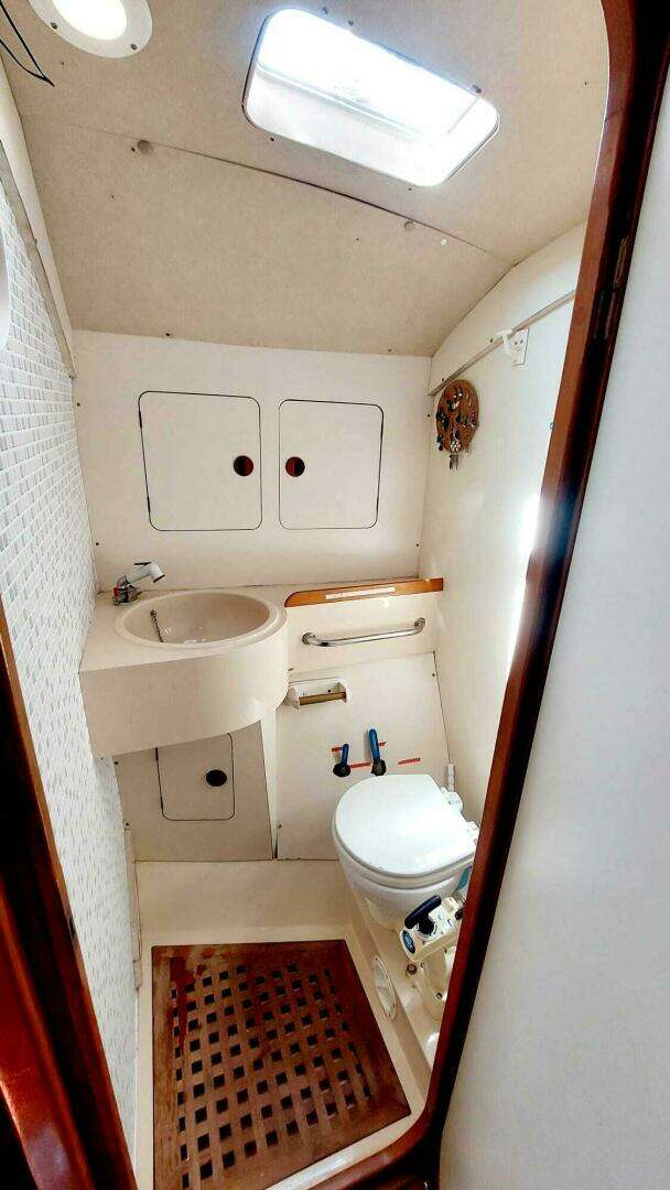 Forward cabin with V-berth convertible to large storage area when not required, with adjacent forward head fitted with Jabsco manual toilet, basin, and shower sump. Opposite the head is a wardrobe and locker space.