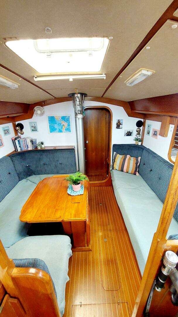 Main saloon features a U-shaped settee to port with a folding dining table and a straight settee to starboard, both with pilot berths outboard for offshore passages. Aft to port is a secure U-shaped galley beside the companionway, and to starboard is a half-size navigation station with a quarter berth behind, currently converted to a technical and storage area.