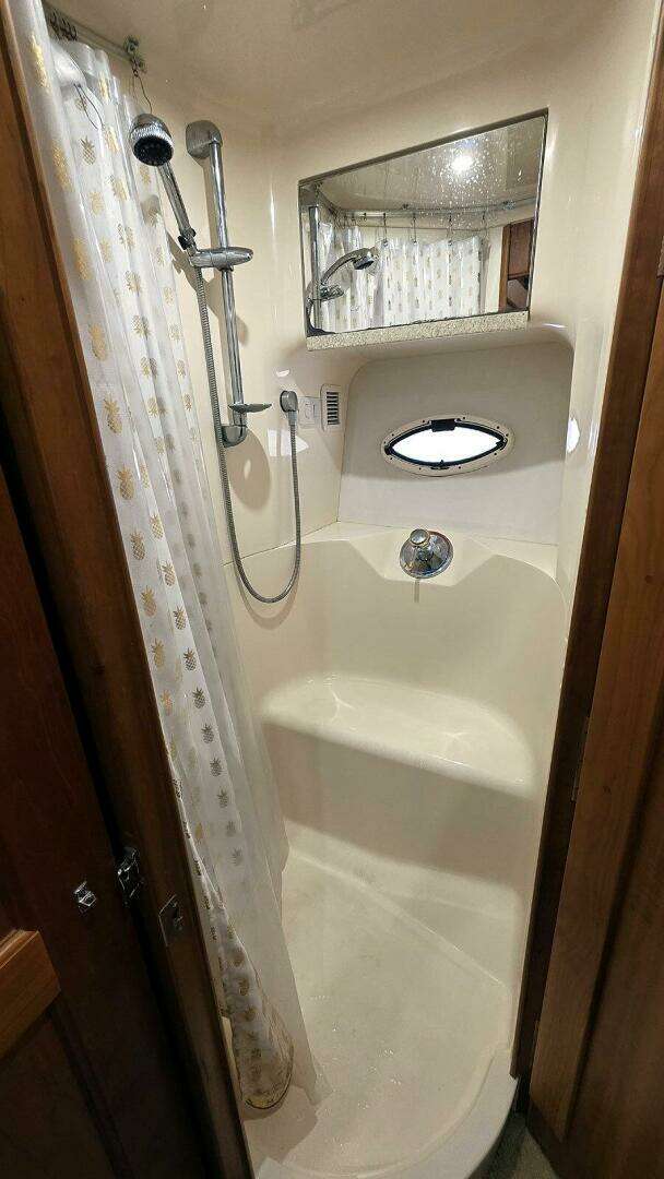 The split head arrangement is designed for privacy and everyday practicality, making it especially well-suited for extended cruising. The head compartment features a Corian-style countertop with an in-counter porcelain sink basin, VacuFlush toilet, mirrored medicine cabinet, and a large mirrored storage cabinet for ample personal storage. Hardwood flooring adds warmth and durability, while under-sink cabinetry provides additional space for supplies. A single portlight brings in natural light and ventilation. The dedicated shower compartment includes a molded seat for comfort, its own mirrored storage cabinet, and a single portlight, allowing one person to shower while another uses the head—an ideal setup for couples or guests aboard.