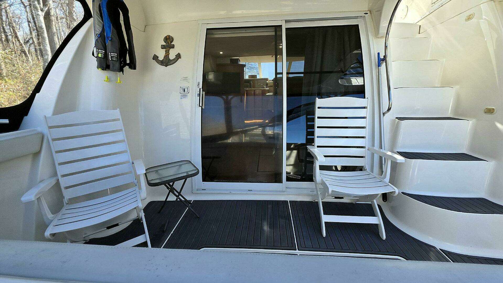 The cockpit is designed for comfortable outdoor living and practical cruising functionality. A full enclosure with Isinglass panels and screens creates a versatile space that can be enjoyed in a variety of weather conditions, effectively extending the salon aft. The SeaDek-covered sole adds comfort underfoot and a clean, modern look, while two folding chairs and a small folding glass-top table provide an inviting setup for casual dockside dining or morning coffee. Access to the spacious lazarette offers valuable storage for cruising gear and equipment.