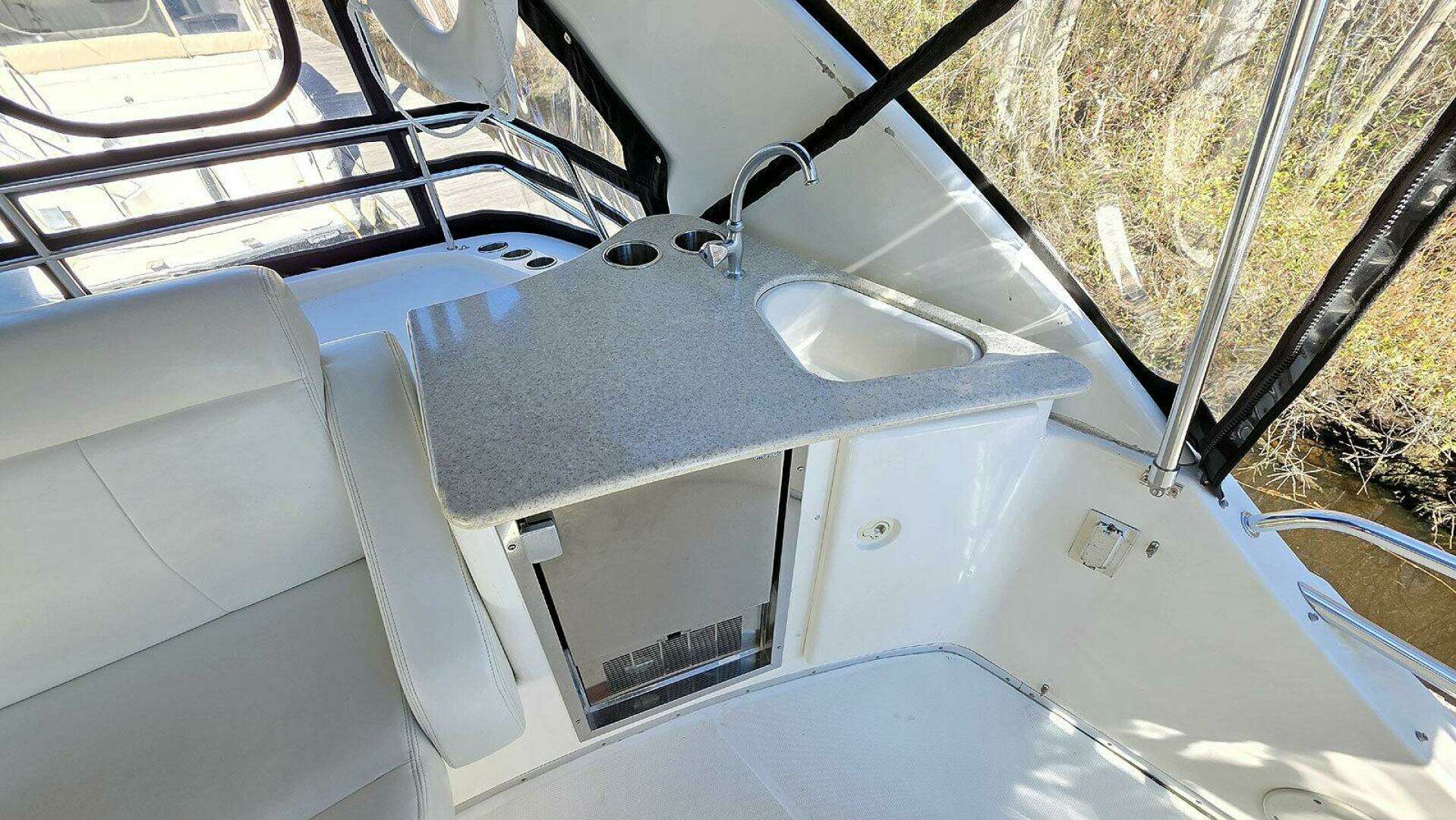 The flybridge is both a commanding helm station and an expansive entertainment space. At the helm, recent upgrades include a new Garmin multifunction display, new radar, new AIS, bow thruster control, backup camera display, and a large Samsung tablet dedicated to navigation, delivering modern situational awareness and confident maneuverability. Guest seating is generous, with a two-place bench seat at the helm, a large bench seat directly aft, and a comfortable portside lounging bench, making this an ideal gathering space underway or at anchor. A well-appointed wet bar with Corian-style countertops, ice maker, and in-counter sink basin enhances onboard entertaining, while a substantial aft storage area provides practical space for cruising gear. The full enclosure with Isinglass panels extends the usable season and adds protection from the elements, and convenient access to both port and starboard side walkways ensures safe movement forward to the bow.