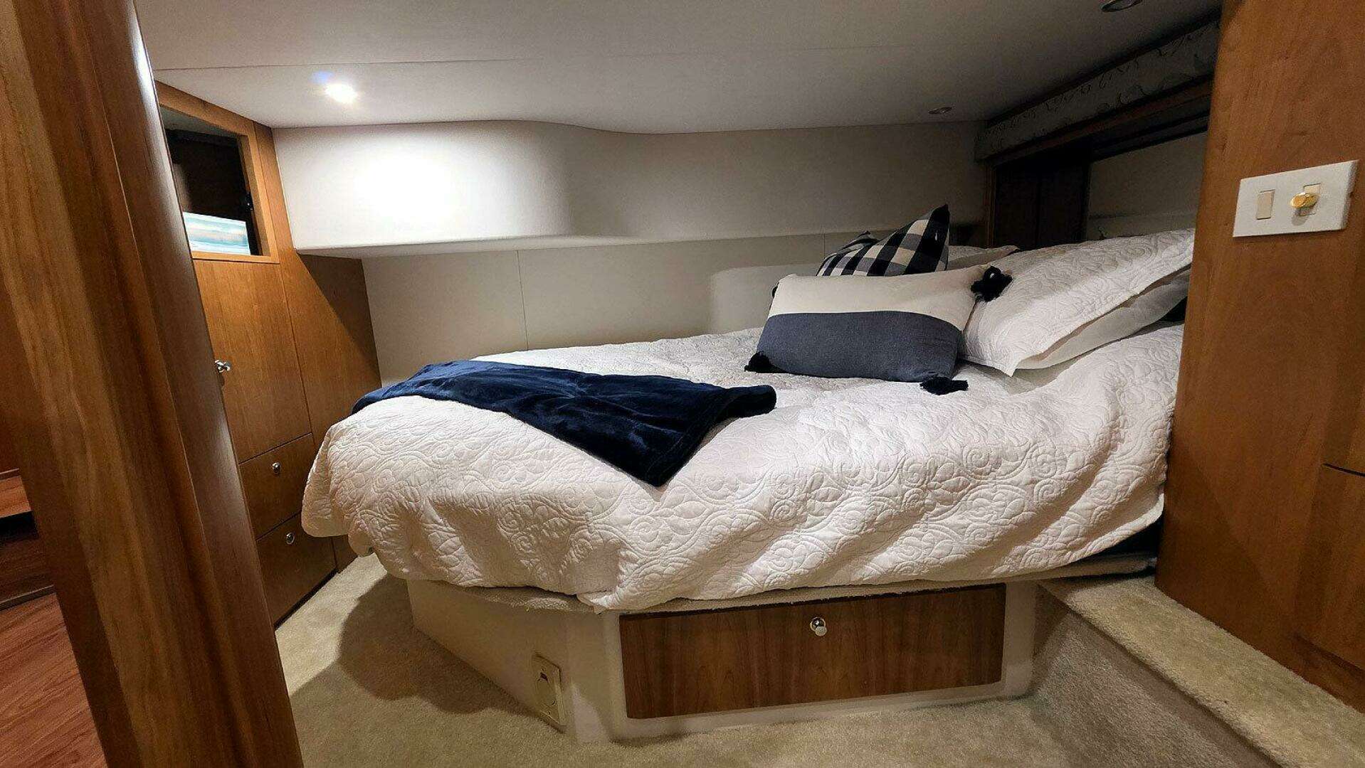 The forward master stateroom offers a comfortable and well-appointed retreat designed for extended cruising. A centered queen-size island berth provides easy walkaround access and features storage beneath, along with three large drawers at the foot of the bed for additional organization. Two generous hanging lockers accommodate extended wardrobes, while side berth shelves offer convenient space for personal items. The carpeted sole adds warmth and comfort underfoot, and natural light and ventilation are provided by two portlights and an overhead hatch. Direct access to both the head and separate shower compartments enhances privacy and functionality, creating a true owner’s suite feel.