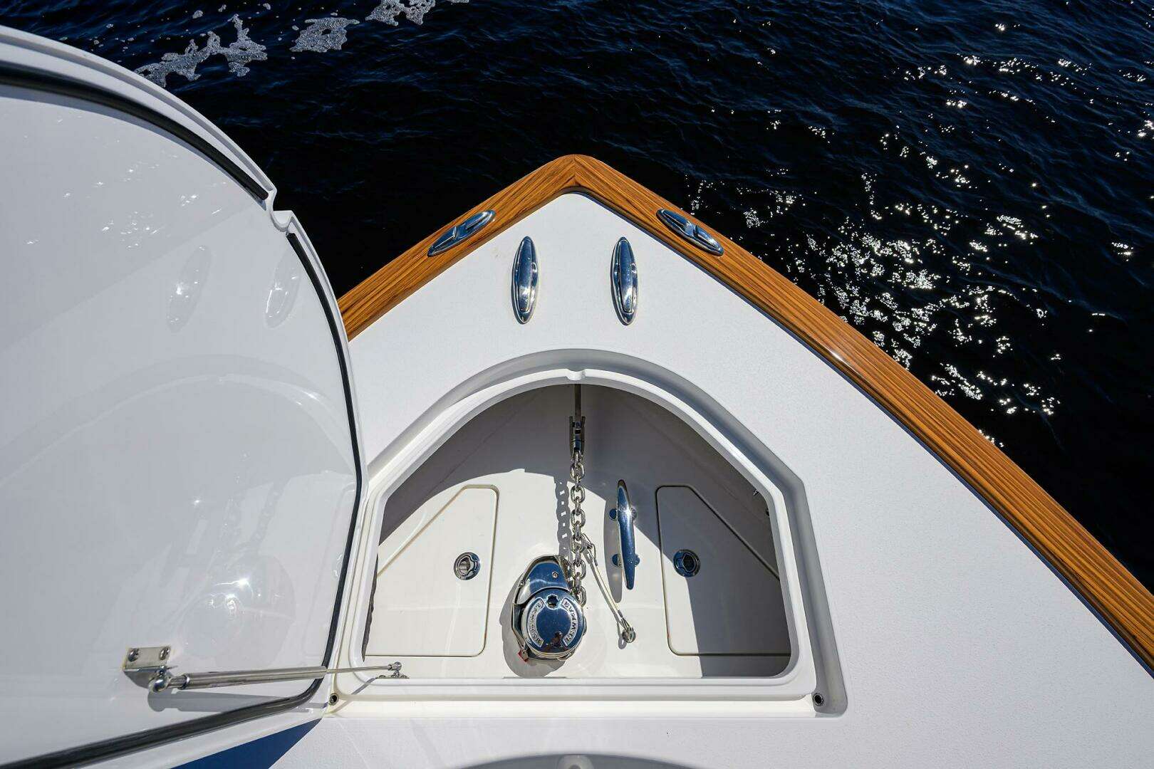 - Electric windlass anchor chute with plow style anchor and winch through stem