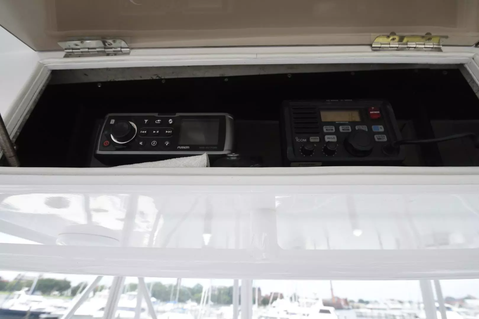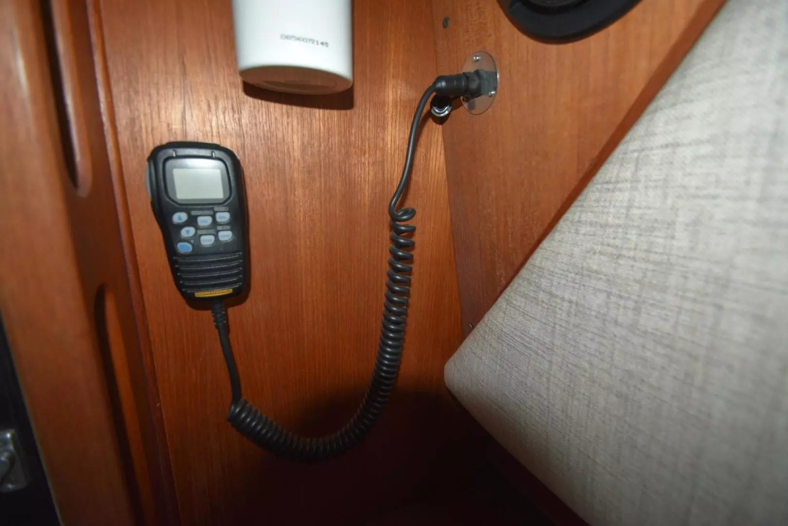 - Icom CommandMic VHF Radio mounted by the salon door, convenient cockpit access