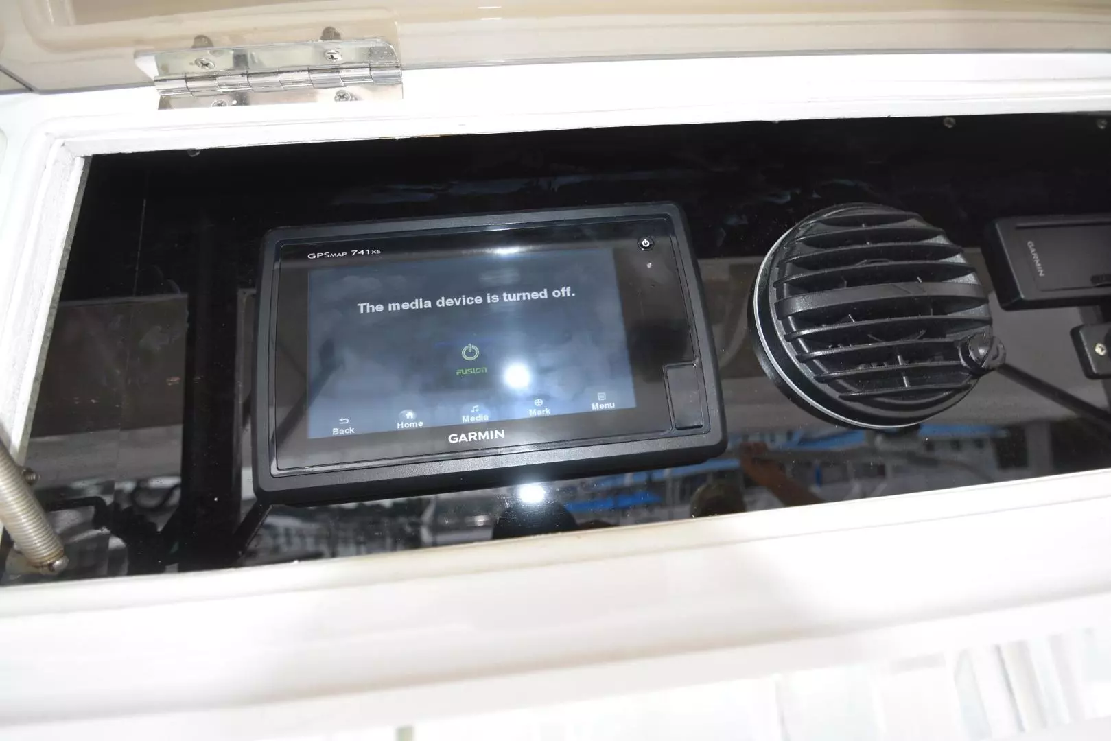- Fusion MS AV700i AM/FM/SiriusXM marine stereo, runs through Garmin Backbone
