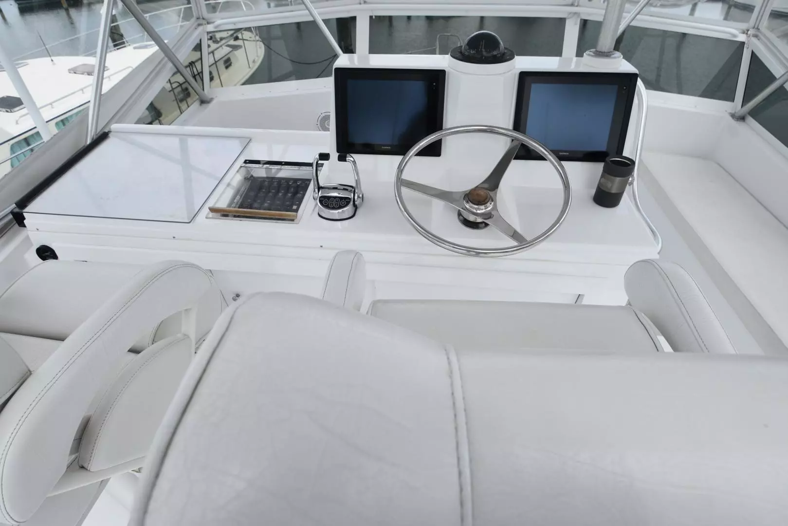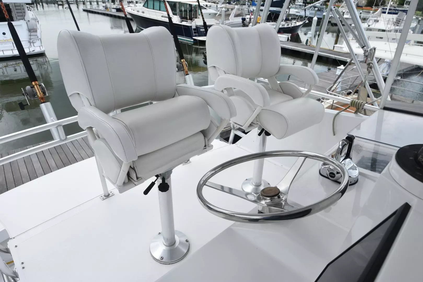 - (2) Pedestal helm chairs with flip up bolsters and weather covers