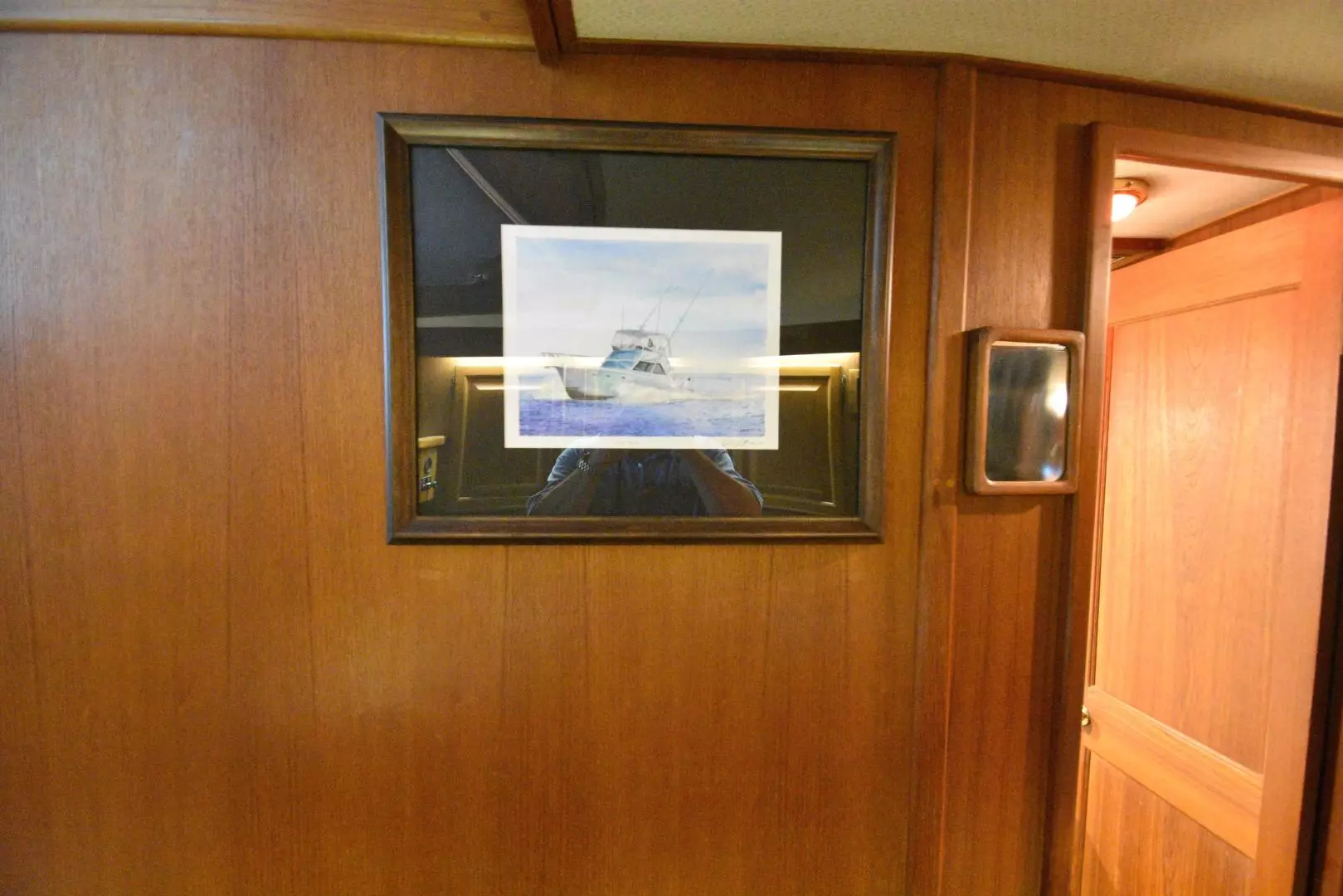- Teak overhead handrail running through the salon