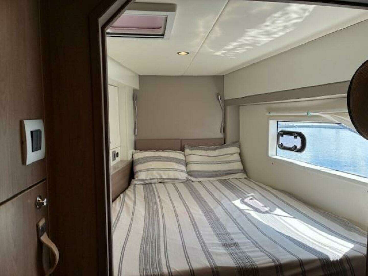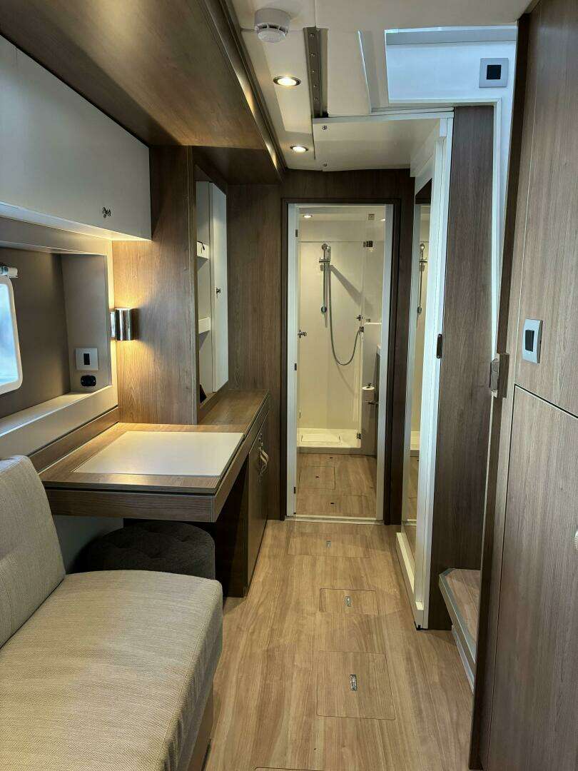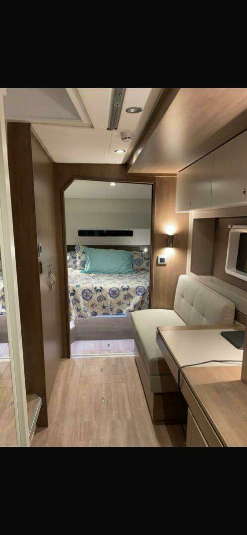 Salon : chart table reading light in leather, folding seat for chart table, salon table with bar, design standing lights with dimmer, padded salon upholstery with armrests, electric rear bay lift system assisted by hydraulic cylinders