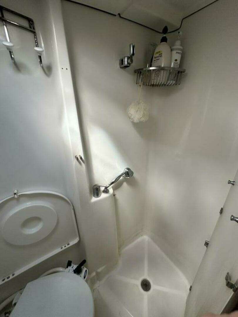 - Adjacent day/guest head with shower, sink, and marine toilet with AC outlet
