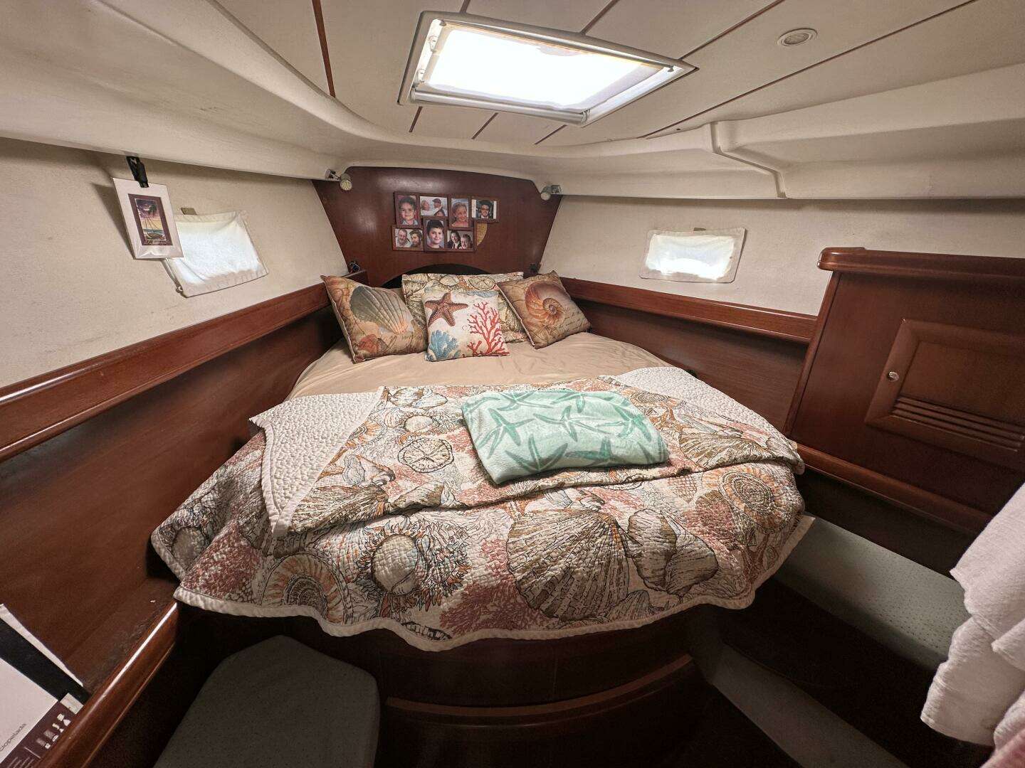 - Queen berth with side access, hanging locker, opening ports/hatches and fan