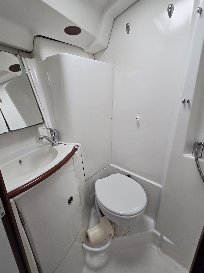 This is the 2 cabin version with owners cabin forward. The berth in owners cabin is centerline with access to both sides of the berth. Included in the master cabin is an in suite head with separate shower. Guest cabin is aft to port and provides a very large berth for guests. The guest/day head is just forward of guest cabin. Forward of the guest head is the nav station. Aft and starboard is the galley. The galley includes propane stove/oven, top loading freezer, side loading refer, and deep double sink with custom high-rise faucet. Salon table lowers to create double berth.
