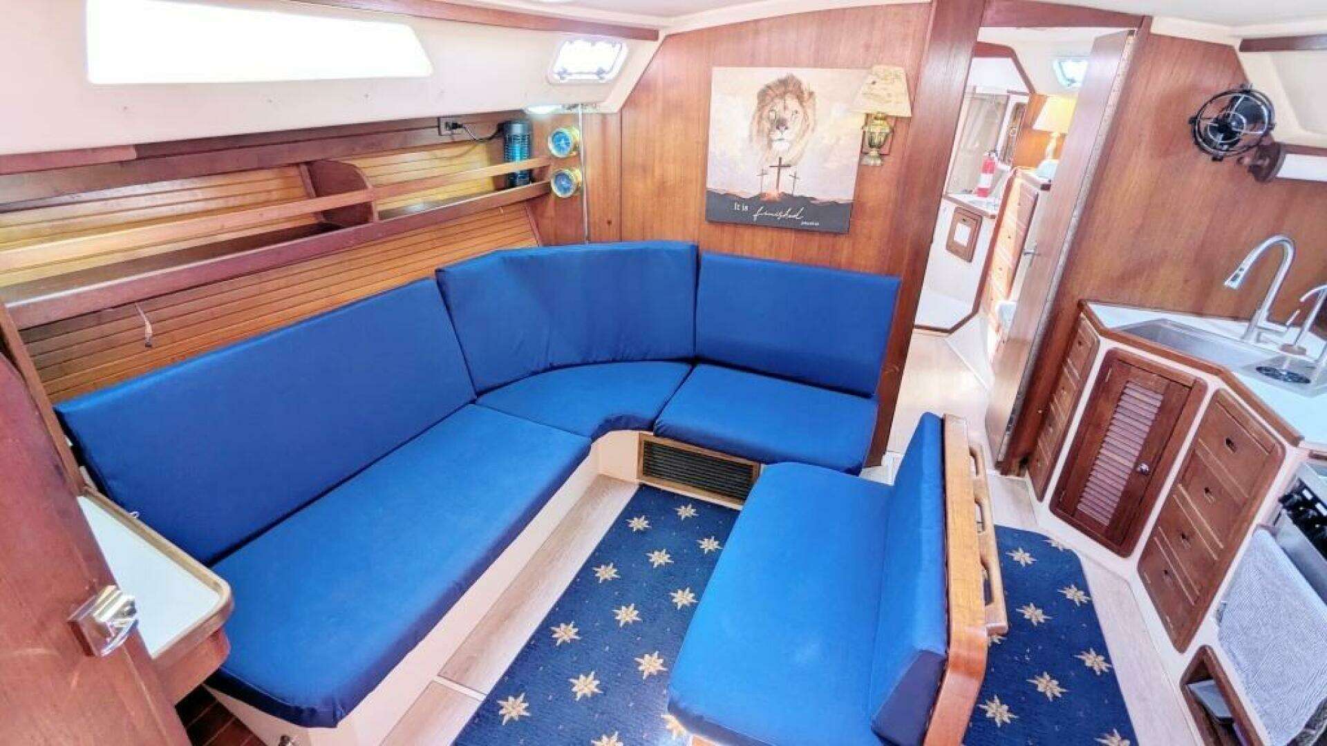 The salon features an L-shape settee to port with additional centerline seating. The centerline seat has a comfortable cushioned back rest and a hand hold on the opposite side. A custom-built cherry table is in the middle of the seating. Two panels in the table can fold up for easy access to seating. Ships clock, barometer and a DC powered Caframo fan are mounted on the forward bulkhead. An additional DC fan is on the aft bulkhead. Wood staving both to port and starboard lend a feeling of warmth and comfort. New laminate flooring was recently installed.