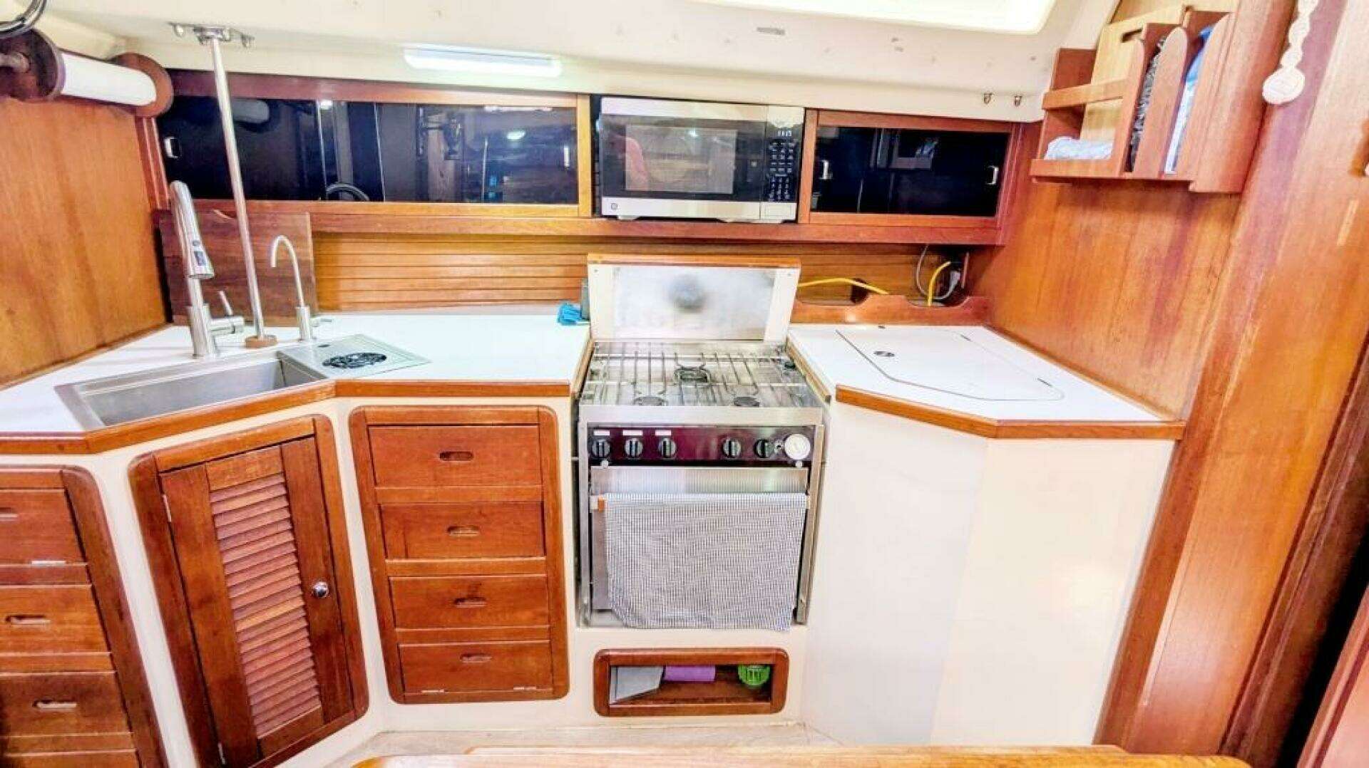 The fully appointed galley is opposite the salon to starboard. The nav station is to port of the companionway and has an aft-facing nav desk and a large TV.