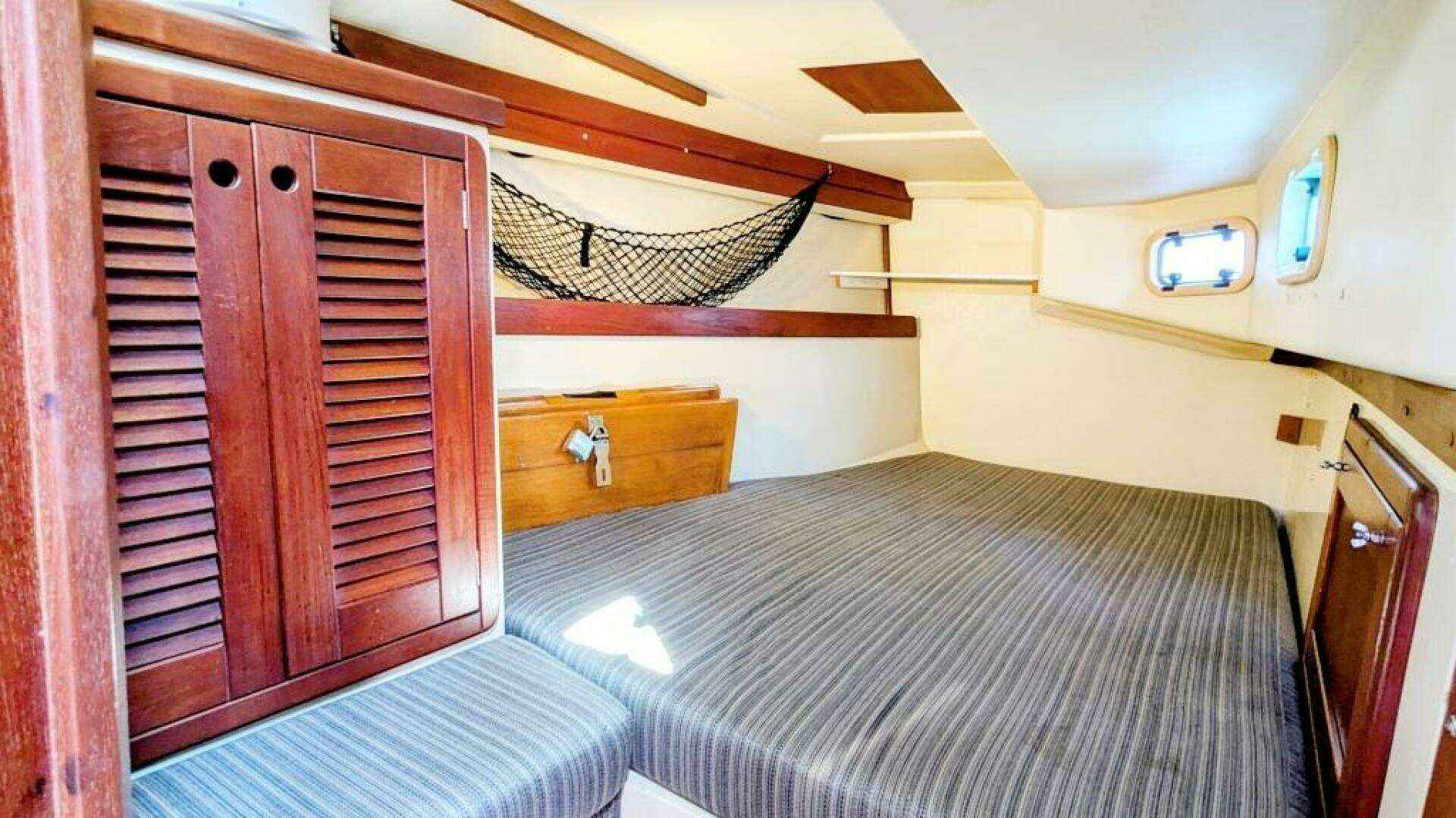 The aft starboard guest cabin has a large berth, locker, two opening ports and a cushioned seat. The aft port guest cabin also has a large berth, locker, cushioned seat and two opening ports.