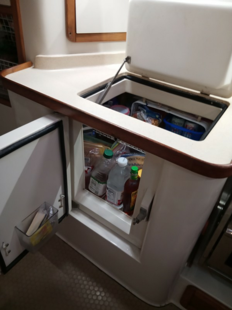 Port side galley with two refrigerator/freezer compartments.U-shaped layout, easy to use even under sail.