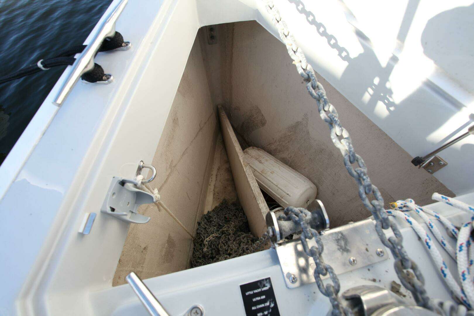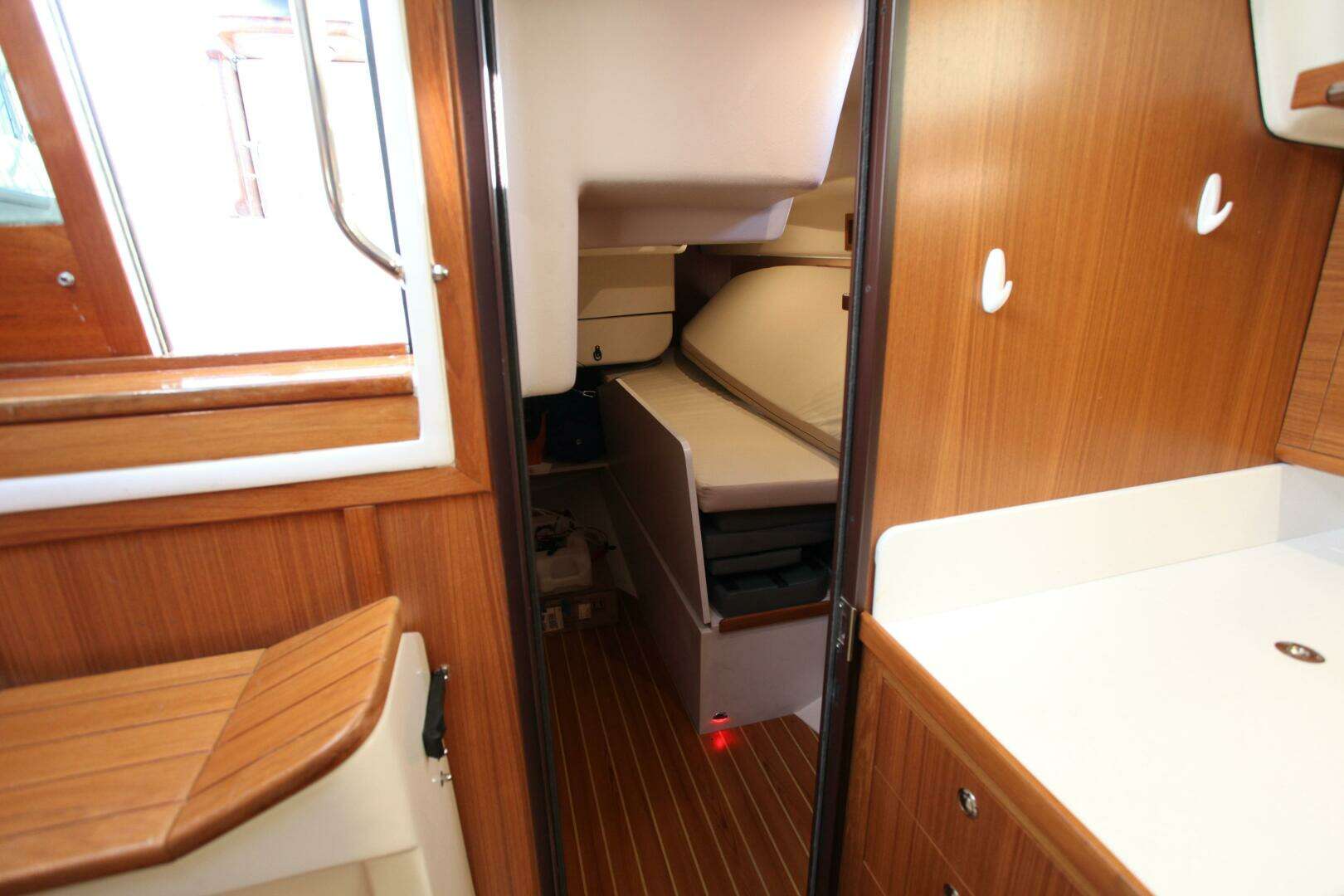 - The port aft double cabin is easily convertible to storage with a large “gull wing hatch” on deck above for access